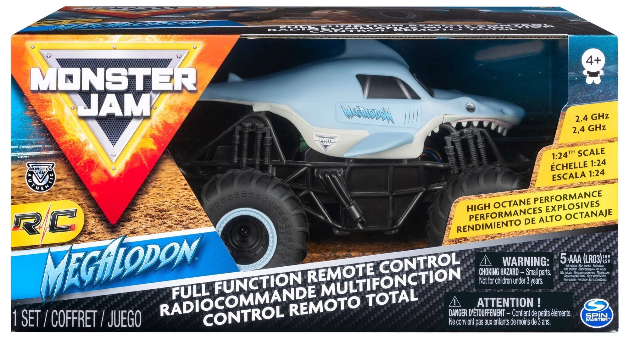 Den licenserede RC-bil MONSTER JAM Megalodon leverer et autentisk look af den ikoniske monstertruck med blå karrosse i haj-stil, finner og tænder. Skalaen 1:24 er ideel til løb derhjemme og de første RC-oplevelser.