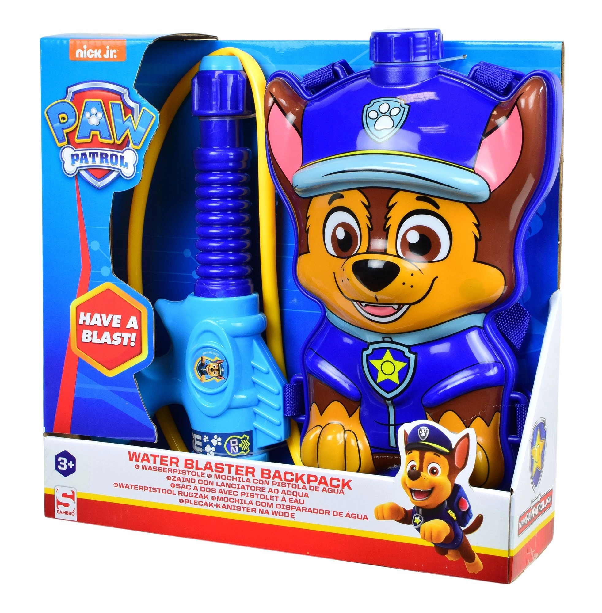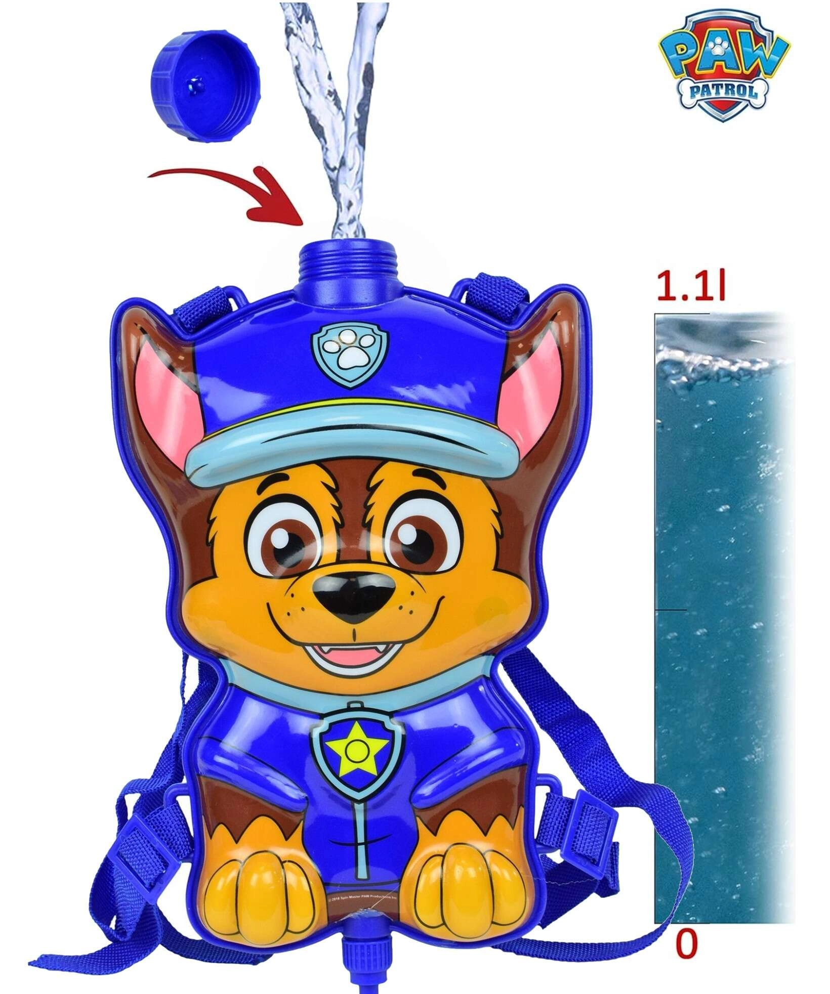 Denne vandrygsæk til børn formet som den populære helt Chase fra PAW Patrol forvandler enhver solrig dag til en fantastisk vandkamp. Fyld tanken med vand gennem det lukbare påfyldningshul, og sprøjt derefter en stråle vand ved hjælp af slangen og den hånddrevne pumpe. Takket være de justerbare stropper sidder rygsækken behageligt på børn i forskellige højder.