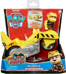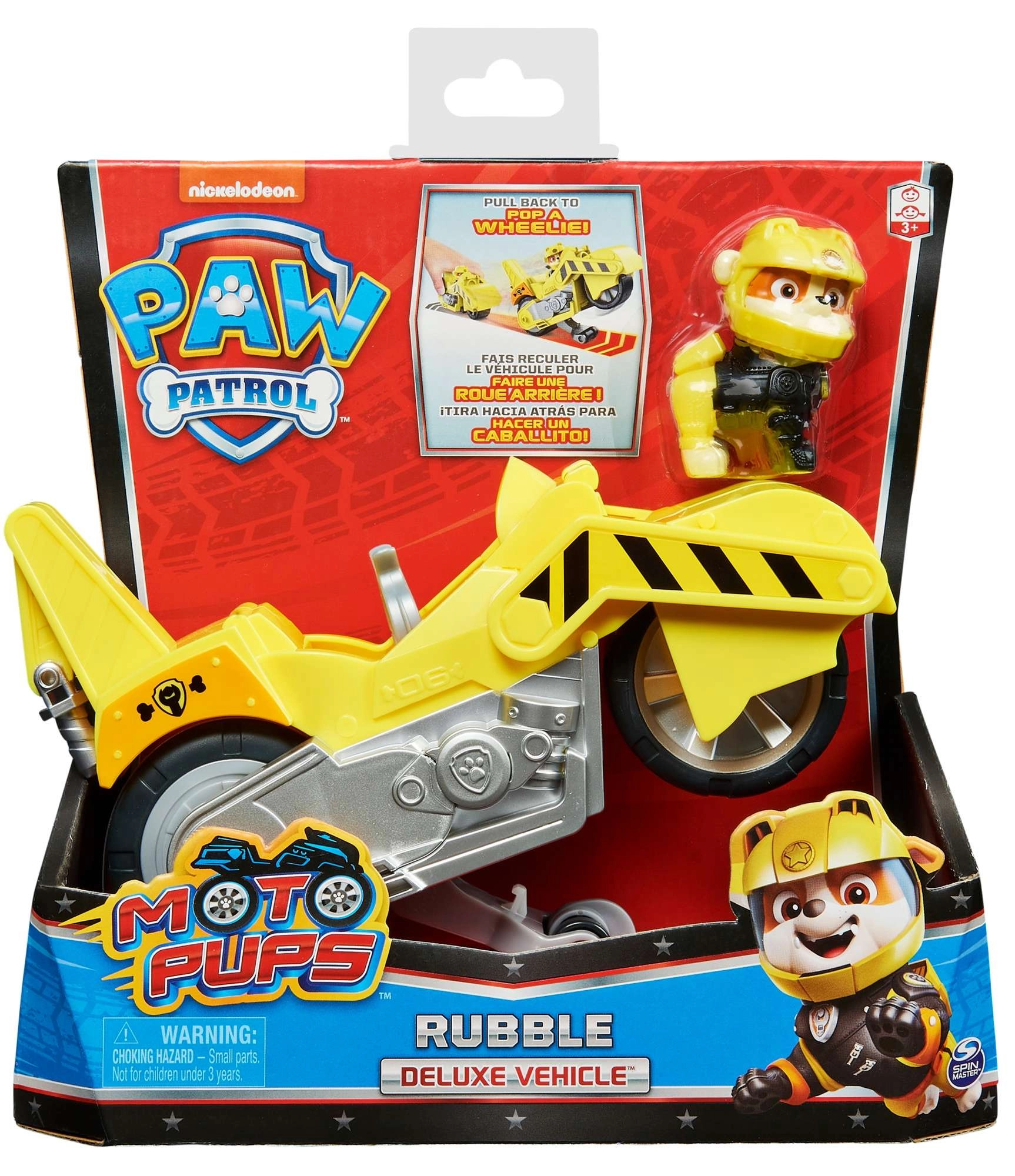 Tag på byggepladsen eller redningsmission med bulldoggen Rubble og hans gule stuntmotorcykel fra Moto Pups-serien. Den robuste konstruktion, markante gule detaljer og store hjul giver fremragende stabilitet, mens pull-back mekanismen sørger for masser af fartfyldt sjov.