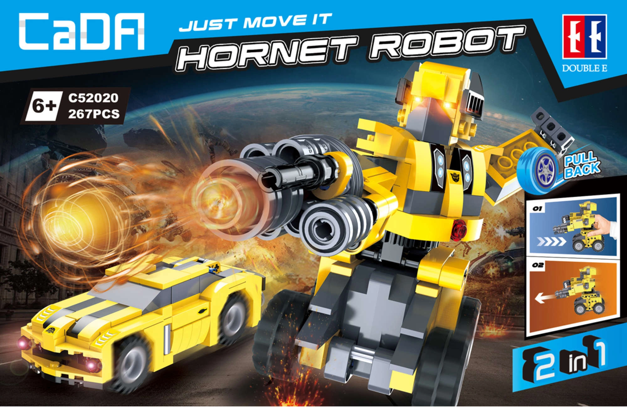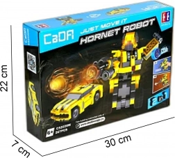 Byggesættet CaDA Hornet fra serien Just Move It giver to byggemuligheder i én æske: byg en posebar robot eller en hurtig bil med pull-back motor. Takket være den overskuelige vejledning kan også yngre byggere klare modellen med hjælp fra en voksen.