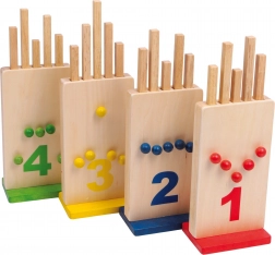 Træspillet The Ruddy Holes er et fængende færdighedsspil for hele familien. Hver spiller vælger en farve og får en tilsvarende konsol. Opgaven er at fordele de små pinde med farvede kuglehoved korrekt og ved hjælp af trædyvler fastgøre dem sikkert i hullerne i den matchende farve. Vinderen er den, der først samler sit farvesæt korrekt.