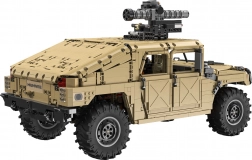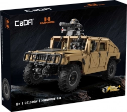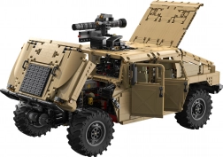 Denne storformatsmodel af HUMVEE i skala 1:8 vil glæde krævende byggere og fans af tekniske byggesæt. Realistiske detaljer omfatter kølergitter, motorrum, instrumentbræt, rat, sidespejle, dobbelte forsæder og et gennemtænkt bagagerum. Et manuelt betjeningshjul muliggør drejning af tårnet, aktivering af granatkaster og rotation af maskingevær.