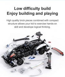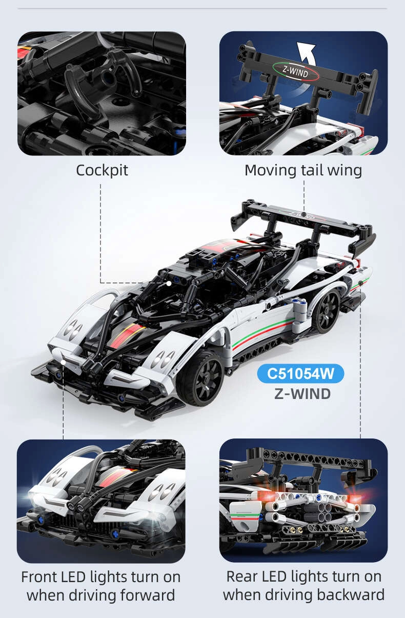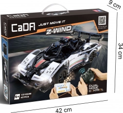 CaDA Z-Wind byggesættet kombinerer byggeglæde med dynamikken fra en fjernstyret model. Den præcist udførte karrosseri i hvid med sorte detaljer, funktionsdygtige LED-lygter og jævn kørsel op til 5,5 km/t gør denne racerbil imponerende både til leg og udstilling.