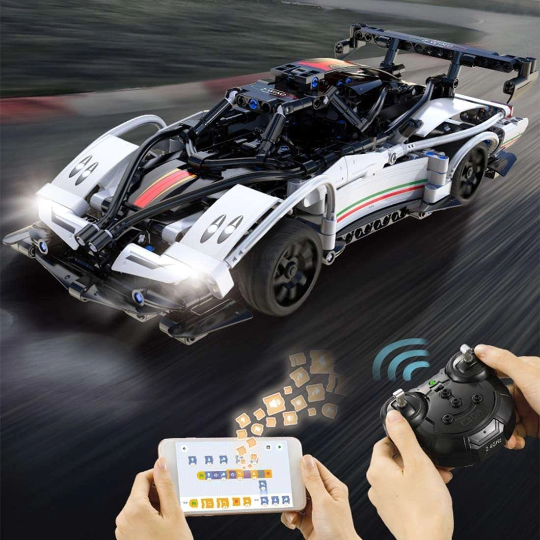 Med Dual Mode skifter du nemt mellem klassisk 2,4 GHz-fjernbetjening og mobilapp (Android/iOS). I appen finder du 4 tilstande: klassisk fjernstyring, gyroskopstyring ved at vippe telefonen, rute-tegning og programmering i Scratch-stil for smart, kreativ kørsel.