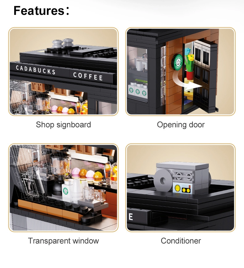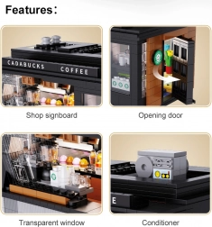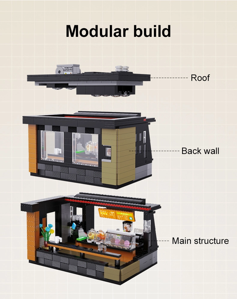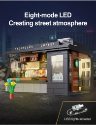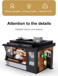 Skab en stilfuld facade og et hyggeligt interiør med espressomaskine, dessertmontré, kopper og dekorationer. Takket være USB LED-lysbånd får caféen en unik caféstemning både aften og dag. Den modulære konstruktion med aftageligt tag og bagvæg gør det nemt at lege og udstille på hylden.