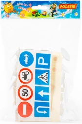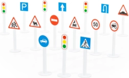 I pakken finder du 16 skilte med en højde på cirka 9,5 cm samt klistermærker til mærkning. Takket være den lette plastkonstruktion er de nemme for børn at håndtere, så de kan øve sig i trafikal orientering – fra fodgængerfelt over indkørsel forbudt til hastighedsbegrænsning.