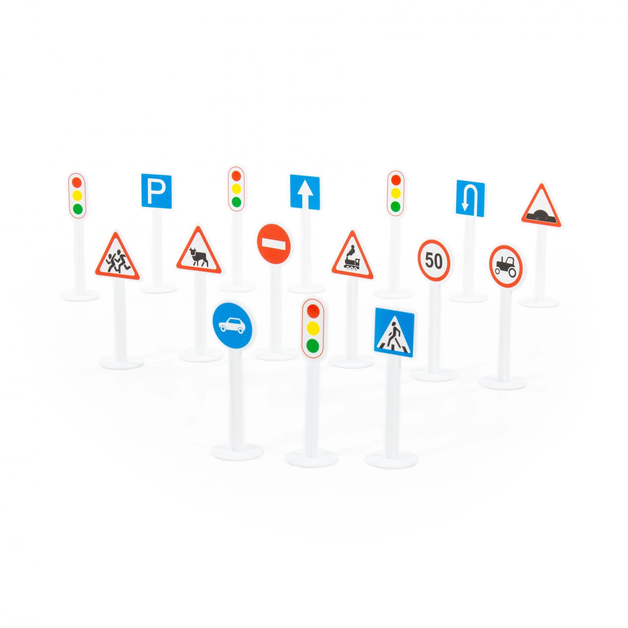 Dette pædagogiske sæt trafikskilte giver børn en legende måde at lære færdselsreglerne at kende på. Hvert skilt har et tydeligt piktogram og står på en stabil sokkel, hvilket gør det perfekt til leg med legetøjsbiler, undervisningsaktiviteter og modelsituationer i klassen.