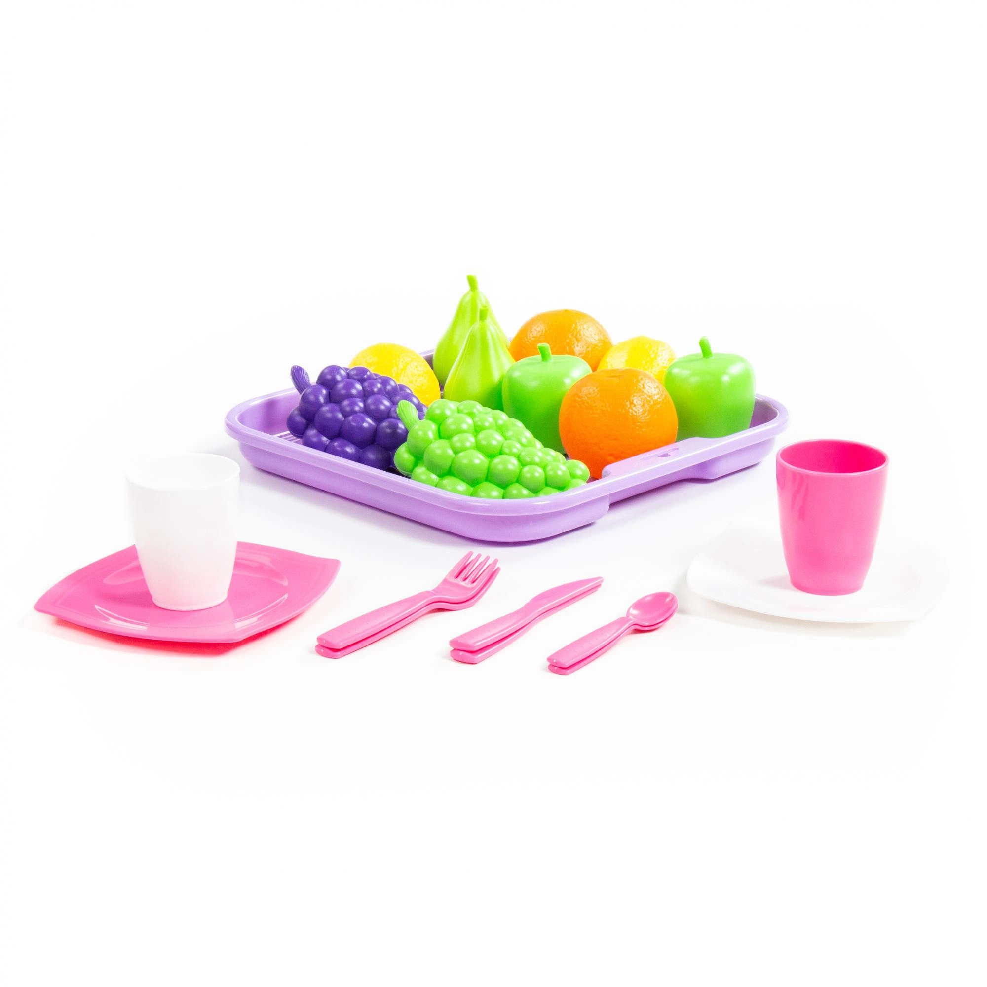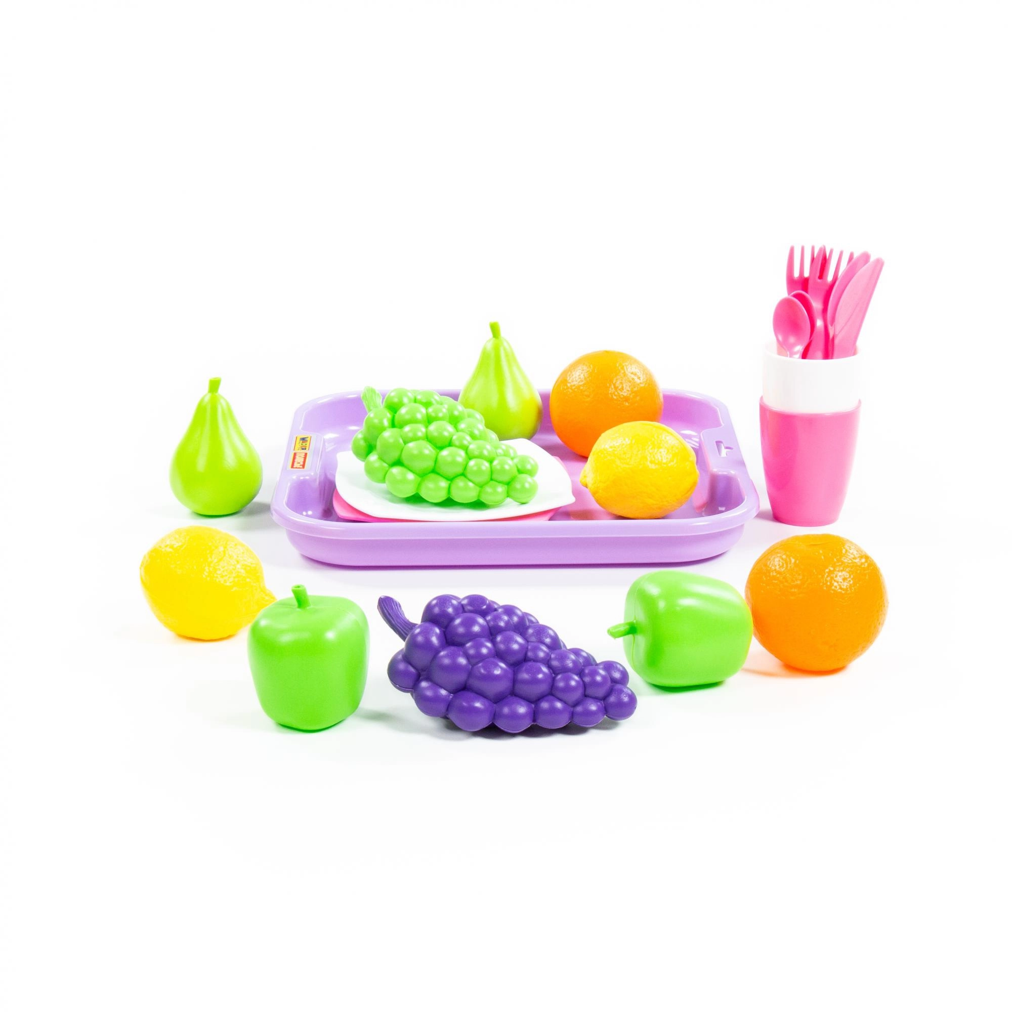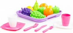 Dette farverige sæt med frugt og service vil glæde enhver lille kok. Børn kan skære, servere og lege fest med realistisk udseende stykker plastfrugt. De lette og holdbare plastdele er nemme at holde om og ryddes hurtigt op på den medfølgende bakke.