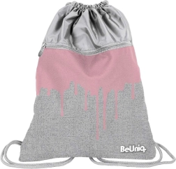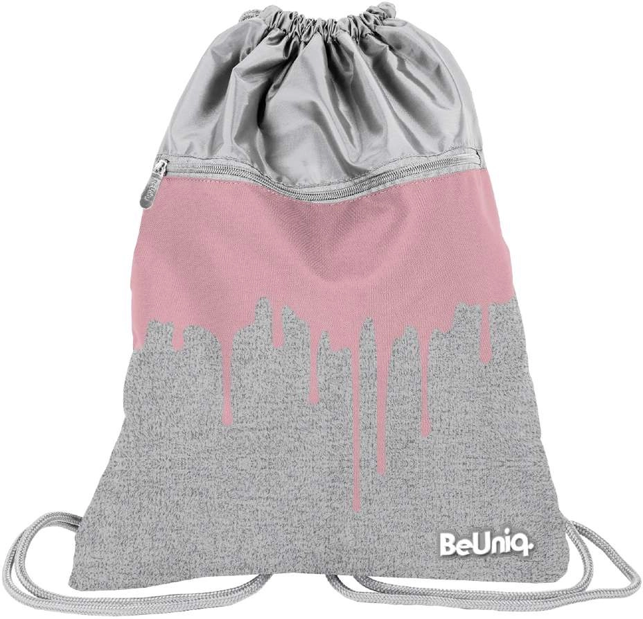 Det grå‑lyserøde drip‑design med BeUniq‑logo kombinerer et moderne look med forstærket ryg og kraftige snore for komfortabel bæring.