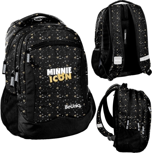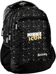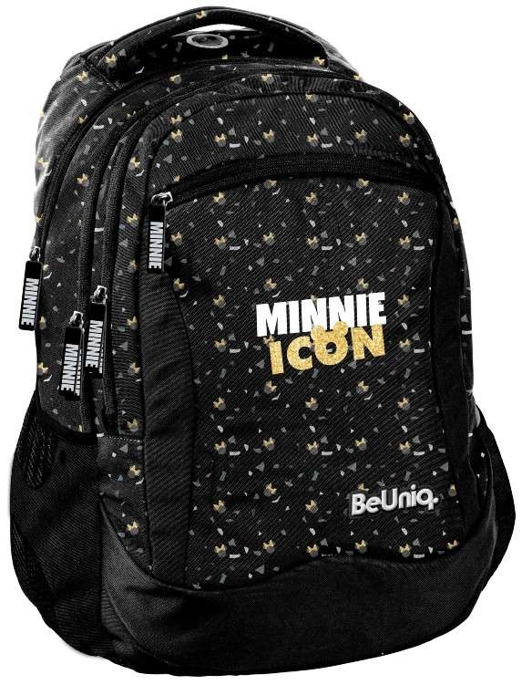 En stilfuld rygsæk med MINNIE-motiv fra BeUniq-kollektionen vil glæde enhver skoleelev. Gennemtænkt organisering med tre hovedrum, forlomme med lynlås og to sidelommer i net giver rigelig plads til bøger, madpakke og flaske. Rygsækken rummmer A4-format uden problemer.