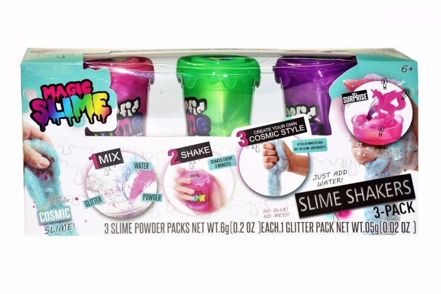 Shakers-sættet til slimefremstilling er et godt valg for alle små skabere. Du skal blot tilsætte vand i shakeren, ryste, og på et øjeblik har du færdig slime klar til leg. Hver shaker indeholder slimepulver og dekorationer, så du kan lave unikke, glitrende og farverige kombinationer. Der medfølger også en figur, som giver den færdige slime et legende præg.