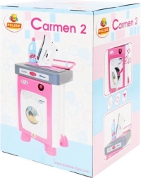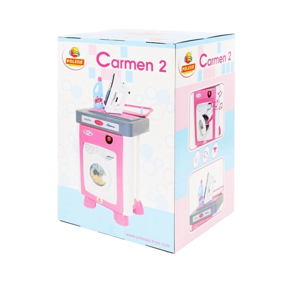 Denne stilfulde børnevaskemaskine CARMEN 2 tilbyder børn sjov og realistisk rolleleg i hjemmet. Frontlågen åbnes og lukkes med et lydsignal, efter valg af program drejer tromlen, og driftslyde afspilles. Hele sættet understøtter fantasi, finmotorik og udvikling af daglige færdigheder.
