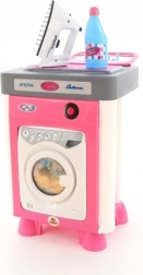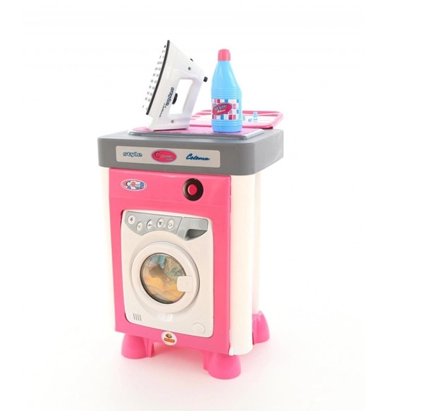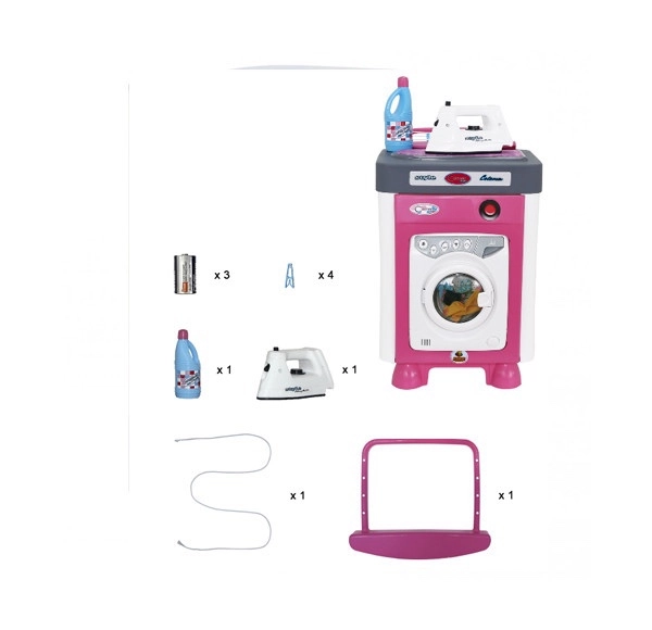 Realistisk børnevaskemaskine med lyd og rigt tilbehør til kreativ leg i hjemmet. Når en tilstand vælges, drejer tromlen virkelig, og der afspilles autentiske vaskemaskinelyde. Sættet indeholder strygebord med tekstiloverflade, strygejern, tørrestativ med snor, klemmer og batterier i pakken.