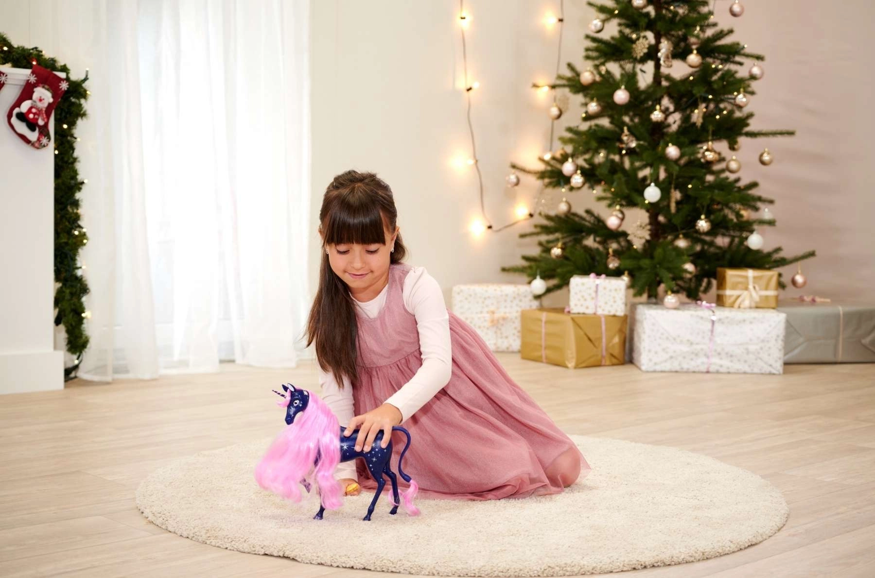 Oplev Centopias magi med den smukke figur af en stjerneenhjørning inspireret af serien Mia and Me. Den mørkeblå krop prydes af mange små stjerner, som lades op i lys og derefter magisk lyser i mørket – som en nattehimmel fuld af glitrende stjerner. Den lange lyserøde manke og hale indbyder til kreativ frisering.