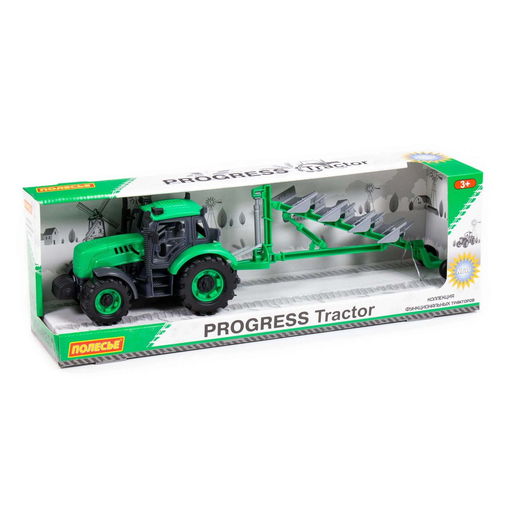Der medfølger en trailer med plov, hvis arbejdsflader kan udskiftes, hvilket giver varieret leg og lærer børn grundlæggende landbrugsaktiviteter. Legetøjet leveres i en farverig gaveæske, velegnet som gave til både drenge og piger.