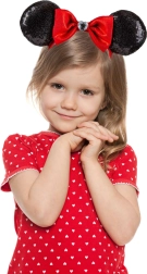 Denne børne-hårbøjle forvandler enhver pige til den elskede figur MINNIE MOUSE. Det bløde materiale i sort og rød er behageligt at have på, ørerne er polstrede for ekstra komfort, og den markante sløjfe med pailletter giver et festligt touch til enhver party.