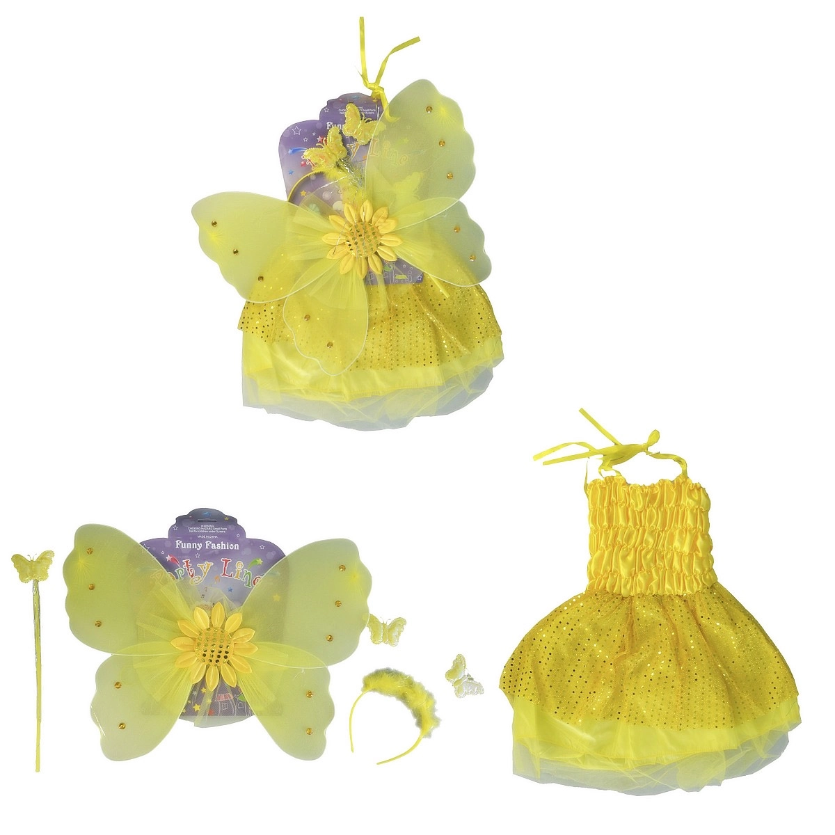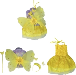 Forvandl dit barn til en glad solsikke! Dette gule kostume er designet til at være komfortabelt, iøjnefaldende og legende. Sættet indeholder en kjole med lette vinger, matchende hårbøjle og en magisk tryllestav – den perfekte kombination til karnevaler, skoleoptrædener eller leg derhjemme.