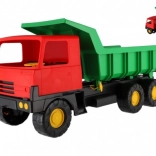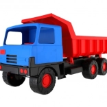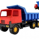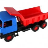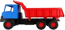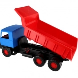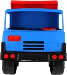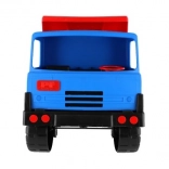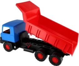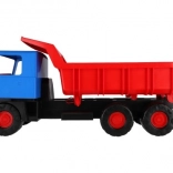 En robust plastlastbil med blå kabine og et rødt tipbart lad vil glæde små byggere både derhjemme og i sandkassen. Takket være den 75 cm lange længde, de slidstærke hjul og den funktionelle tipmekanisme kan den transportere sand, småsten og legetøj. Den lette og sikre konstruktion understøtter kreativ leg og udendørs leg.
