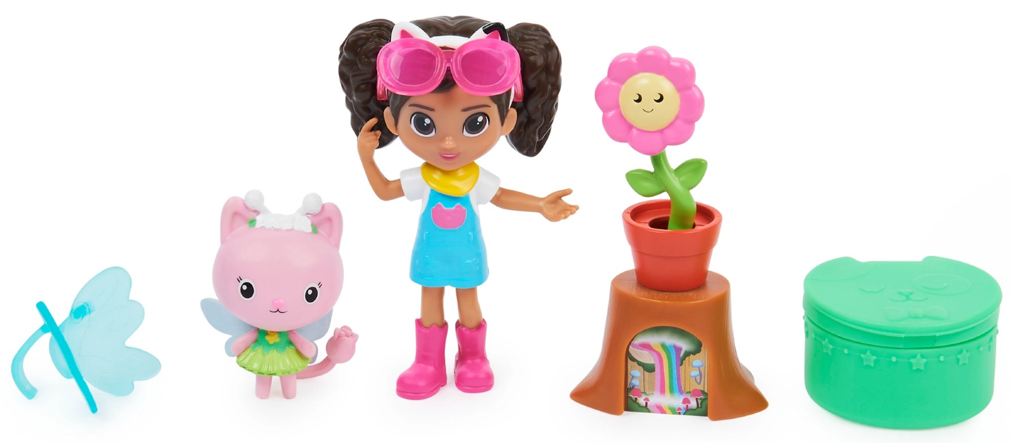 Dette søde sæt tager børnene med ind i Gabby’s Dollhouse-universet. Gabi har ikonisk hårbøjle med katteører, lyserøde briller og et farverigt outfit. Når man trykker på hovedet, glider brillerne magisk ned på næsen eller løftes, hvilket giver legen et interaktivt element. Den fe-agtige kat Kitty Fairy, blomsten i potte og et hemmeligt tilbehør giver mulighed for kreative havescener.