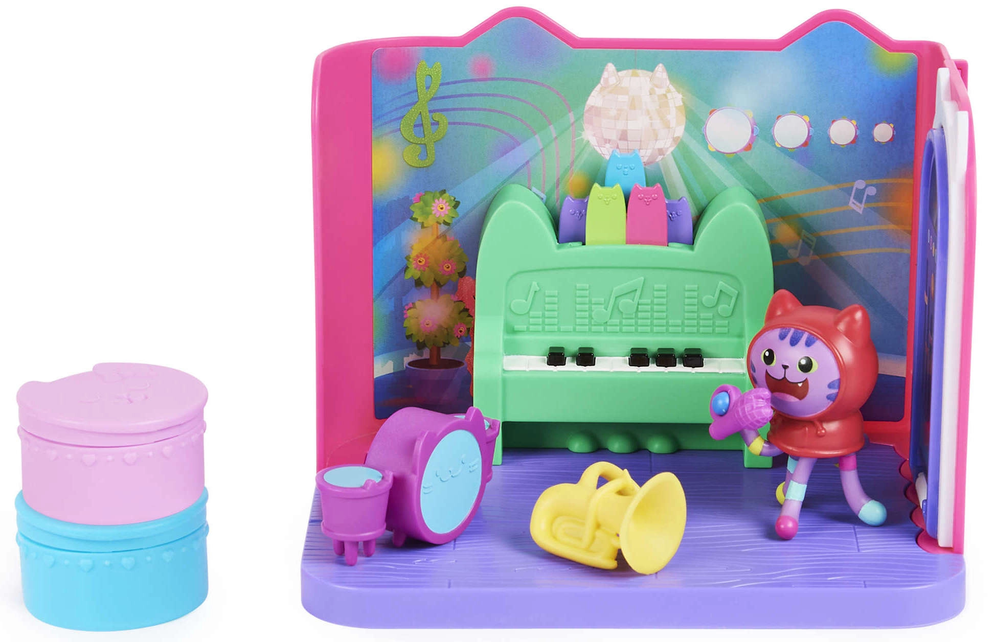 Udvid eventyret i Gabbys kattehus med musikværelset inklusive figuren DJ Catnip! Dette sæt bringer magisk musiksjov, kreativ rolleleg og kompatibilitet med andre værelser og huset. Børn vil elske de funktionelle klaver-tangenter, der løfter farvede katte, samt de gennemarbejdede accessories, der giver uendelig fantasi.