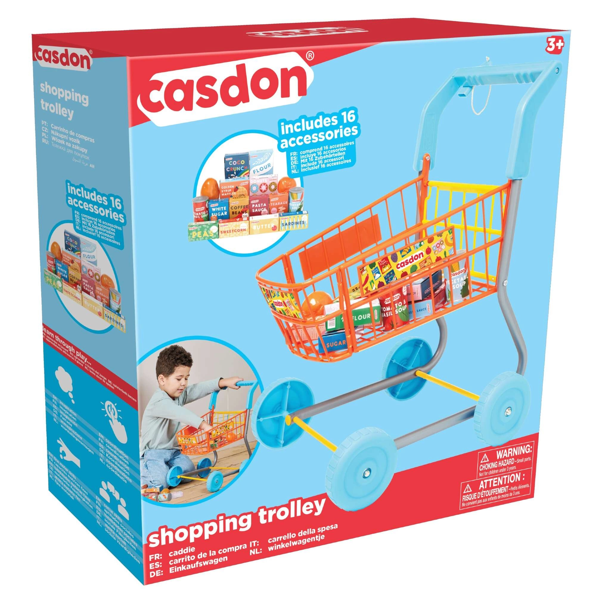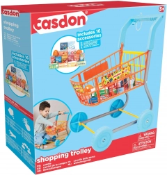 Pakken indeholder 16 realistisk trykte æsker og dåser med dagligvarer samt plastfrugt/grøntsager, som hjælper børn med at øve sortering, talforståelse og sociale færdigheder i købmandsleg. Ved håndtaget hænger en lille fløjte/jeton for en endnu mere autentisk indkøbsoplevelse.