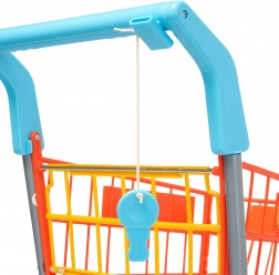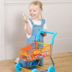 Denne børneindkøbsvogn er et godt valg til små ekspedienter og kunder. Kombinationen af orange kurv, blåt håndtag og hjul samt gule detaljer virker indbydende og understøtter kreativ leg. De brede hjul sikrer stabilitet og nem manøvrering indendørs.