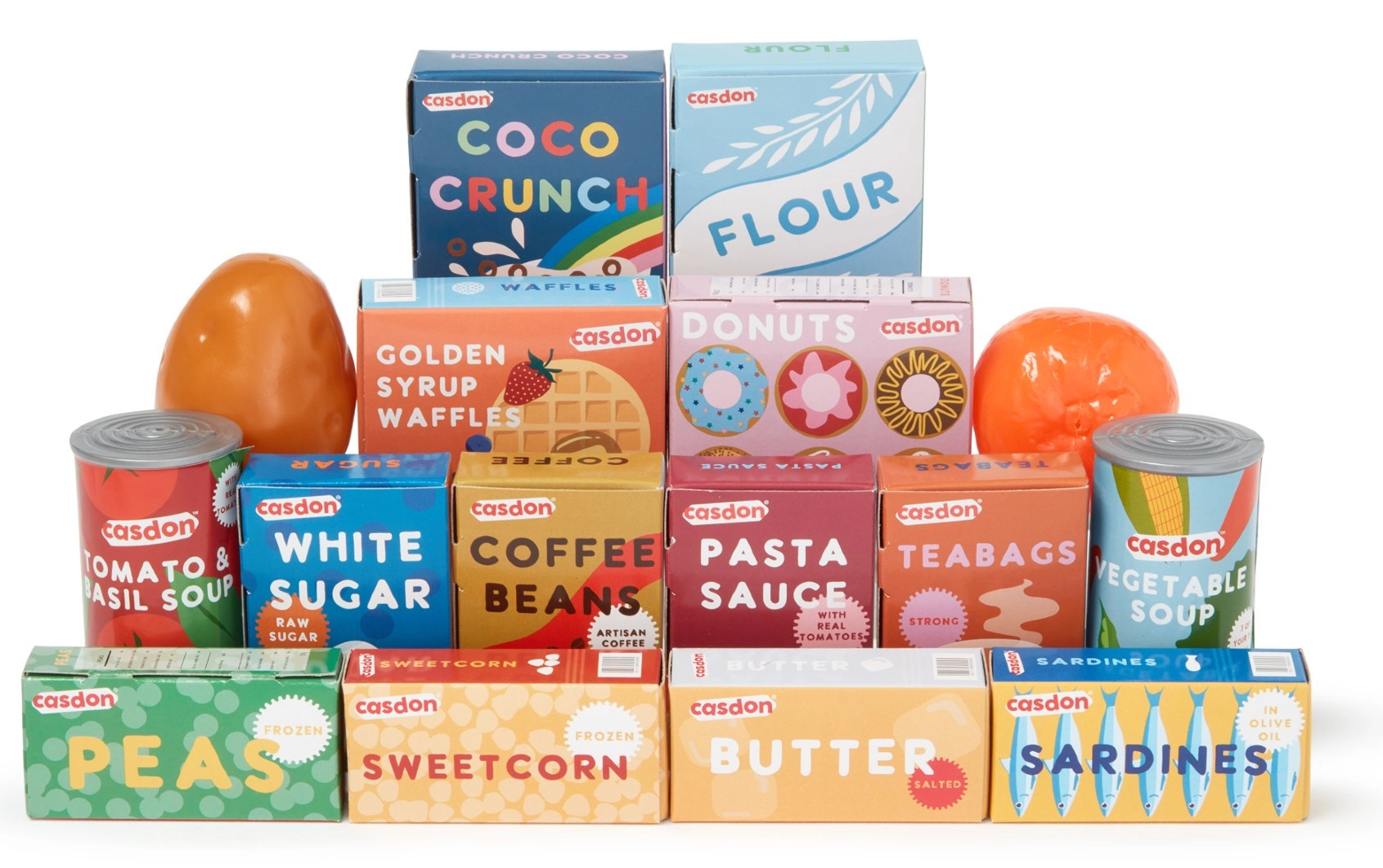 Indeholder 16 stykker imitationer af dagligvarer: æsker og dåser med print (mel, te, kaffe, ærter, sukker m.m.) samt plastfrugt/grøntsager.