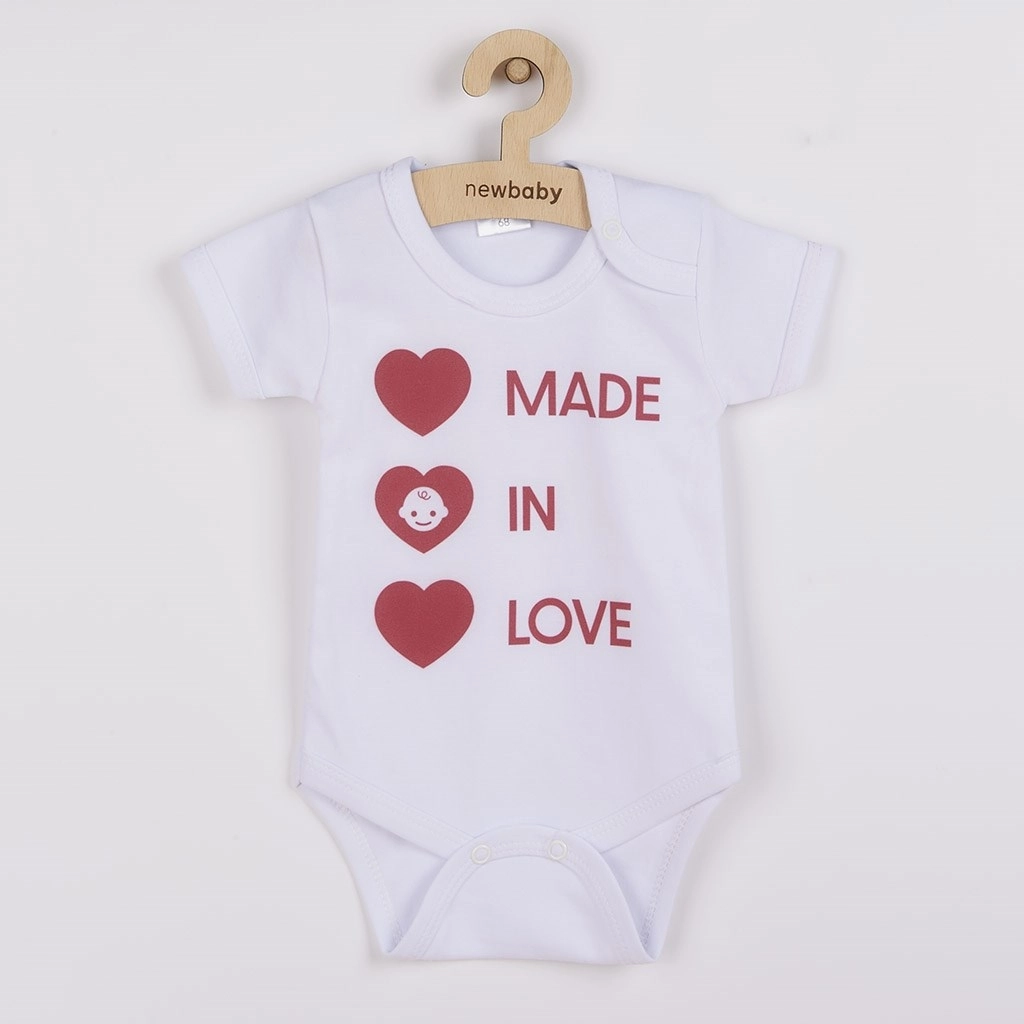 Stilrent og blødt babybody New Baby MADE IN LOVE er ideelt som det første outfit og som en kær gave til babys startpakke. Takket være den kvalitetsrige bomuldsjersey er det behageligt at røre ved, ånder godt og irriterer ikke den sarte hud hos nyfødte.