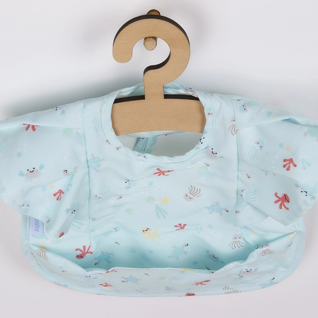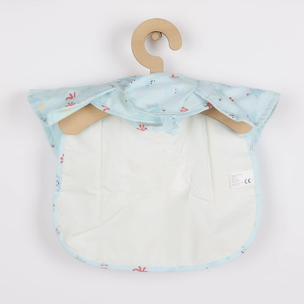Den nederste del er foret med et vandtæt lag, der effektivt forhindrer gennemvædning. Lommen af to lag materiale opfanger krummer og dråber og holder omgivelserne renere. Når den bliver snavset, kan savlesmækken blot tørres af med en fugtig klud eller vaskes i maskine.