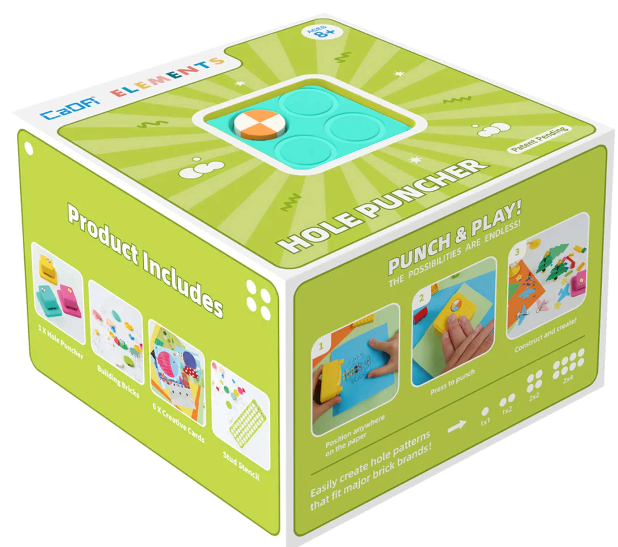 I pakken finder du alt til at komme i gang med det samme: hullemaskine med base, 99 klodser, 2 skabeloner med huller og 6 pyntekort. Sættet er kompatibelt med andre CADA-sæt, så du nemt kan udvide det og tage kreativiteten endnu længere.