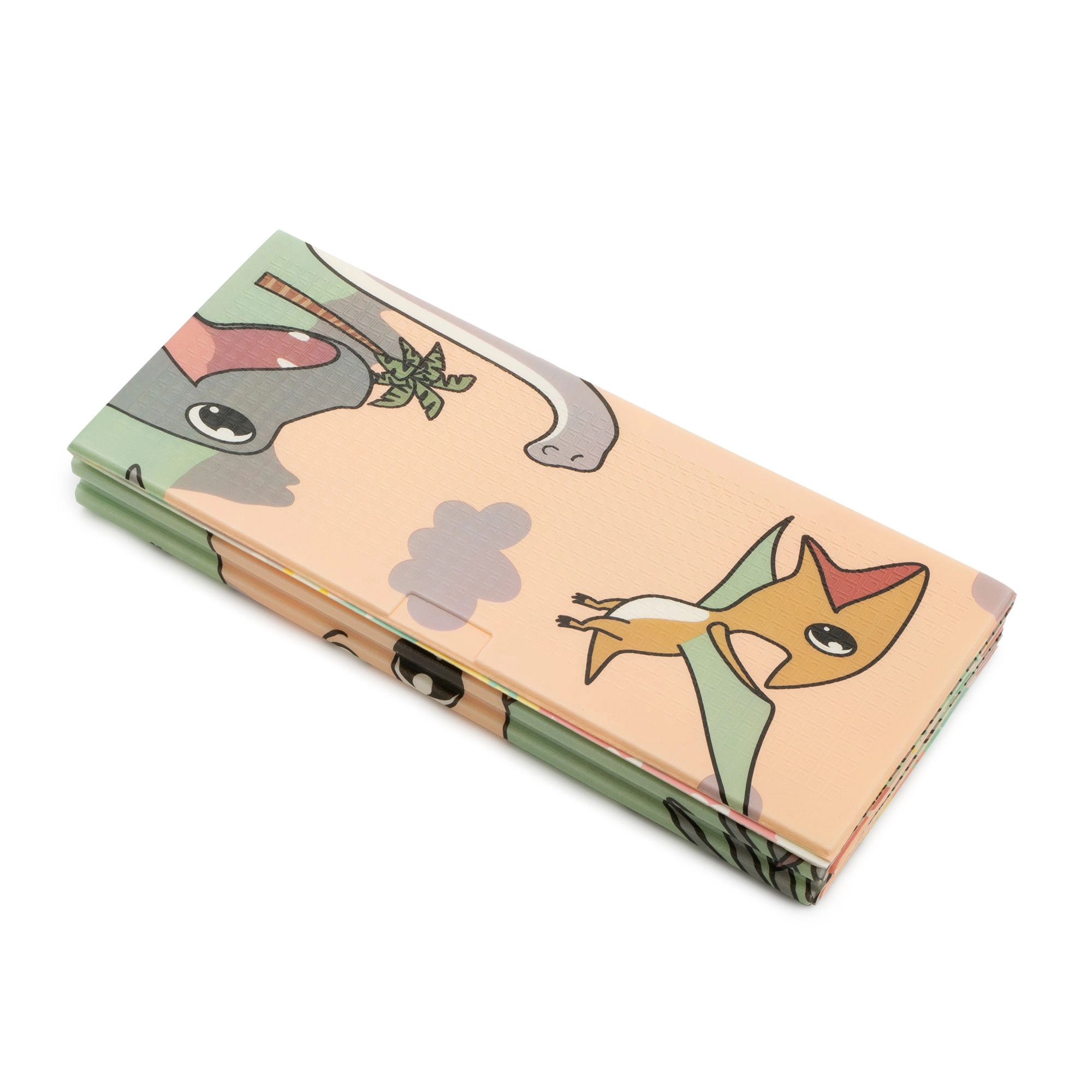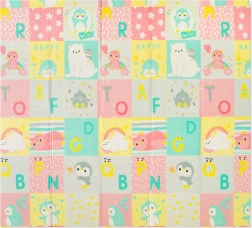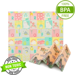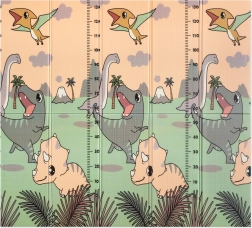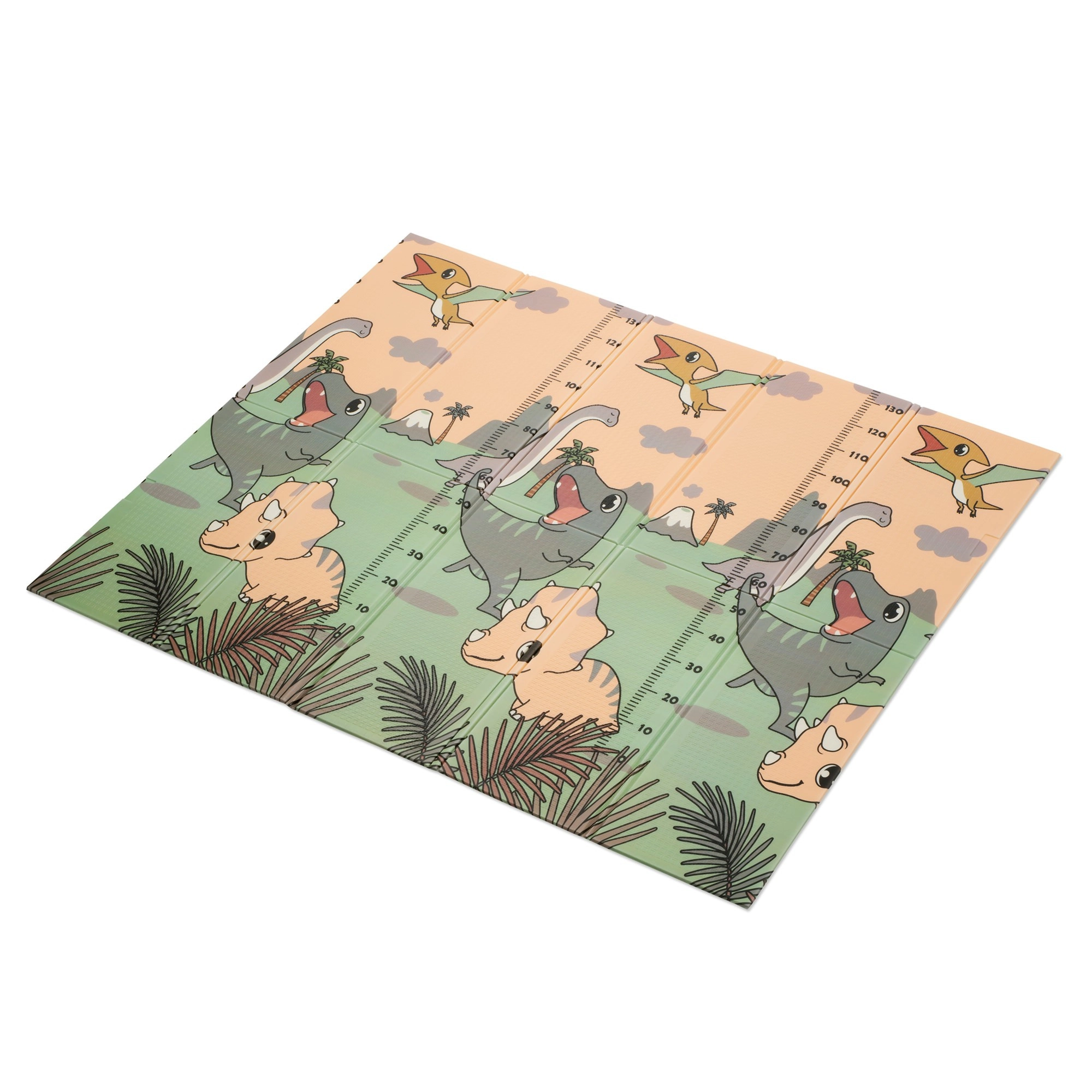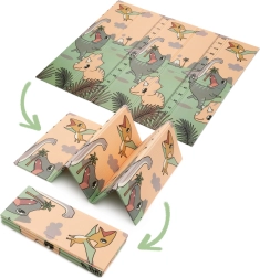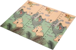Begge sider har pædagogisk print i blide pastelfarver: søde dinosaurer med højdemåler og motiv med dyr og bogstaver. Den skridsikre overfladestruktur støtter sikker læring i kravlen og gang og stimulerer samtidig den sensoriske udvikling. Overfladen er vandafvisende og kan tørres af med en fugtig klud.
