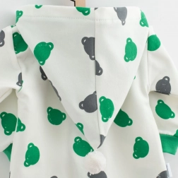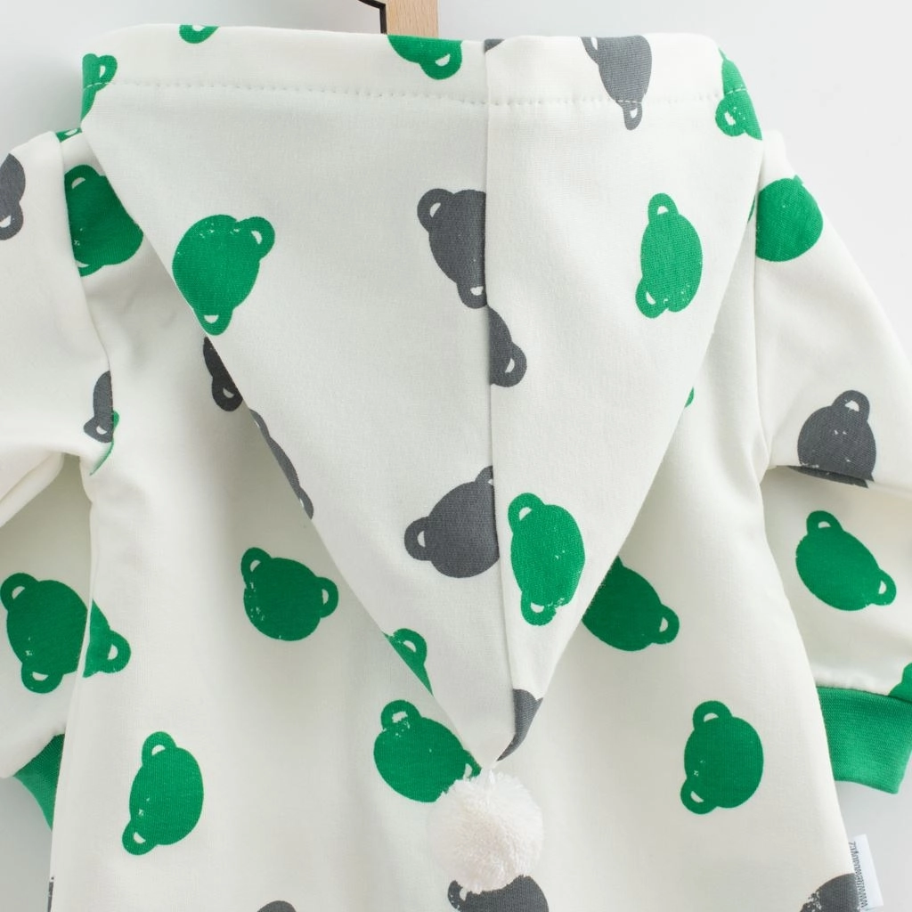 Designet med allover bamseprint, hætte med farvet foer og dekorativ kvast gør heldragten til et legende stykke i enhver babys garderobe. Elastiske ribkanter ved ærmer og ben sikrer, at tøjet sidder godt og holder formen.