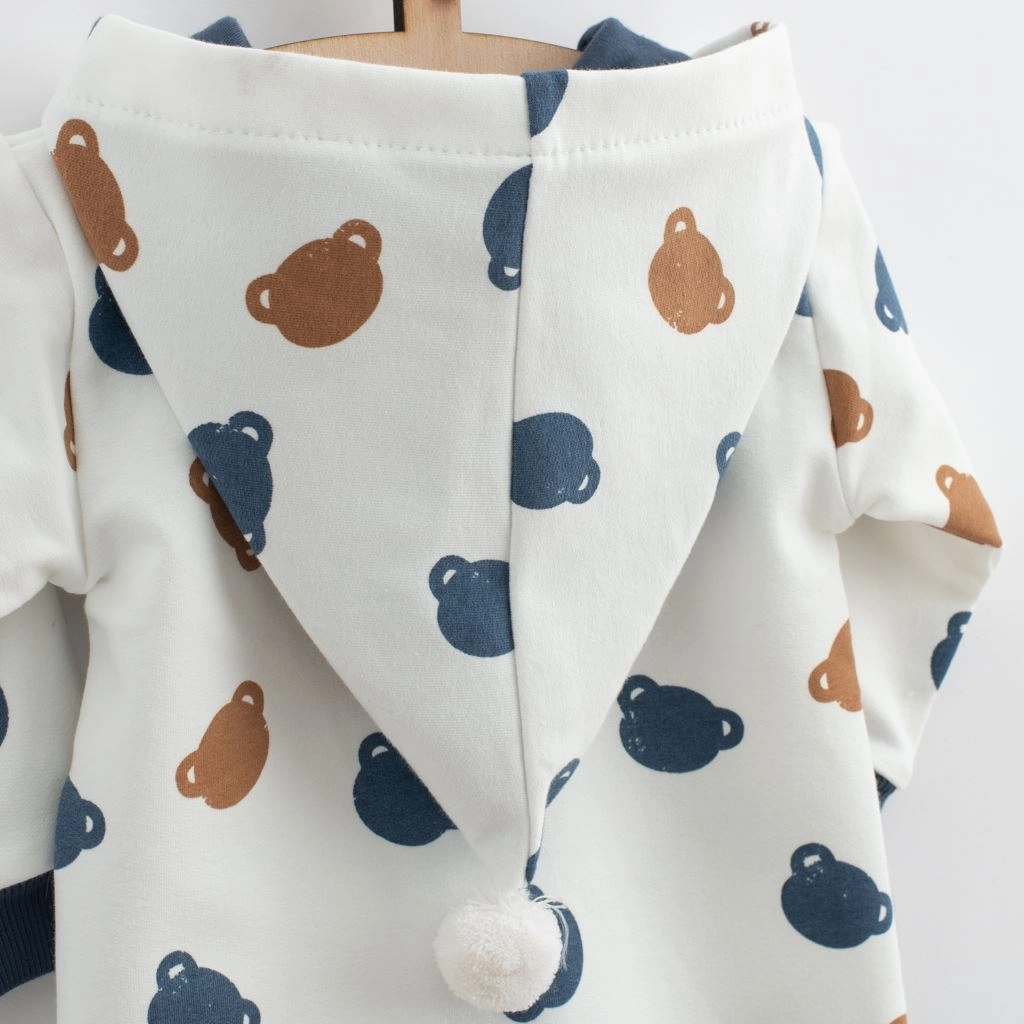 Dragten er allover-printet med bjørne og har elastiske kanter på ærmer og ben, som holder faconen og beskytter mod kulde. Et godt valg til hjemmebrug, gåture og barnevognen – en alsidig favorit året rundt.