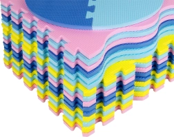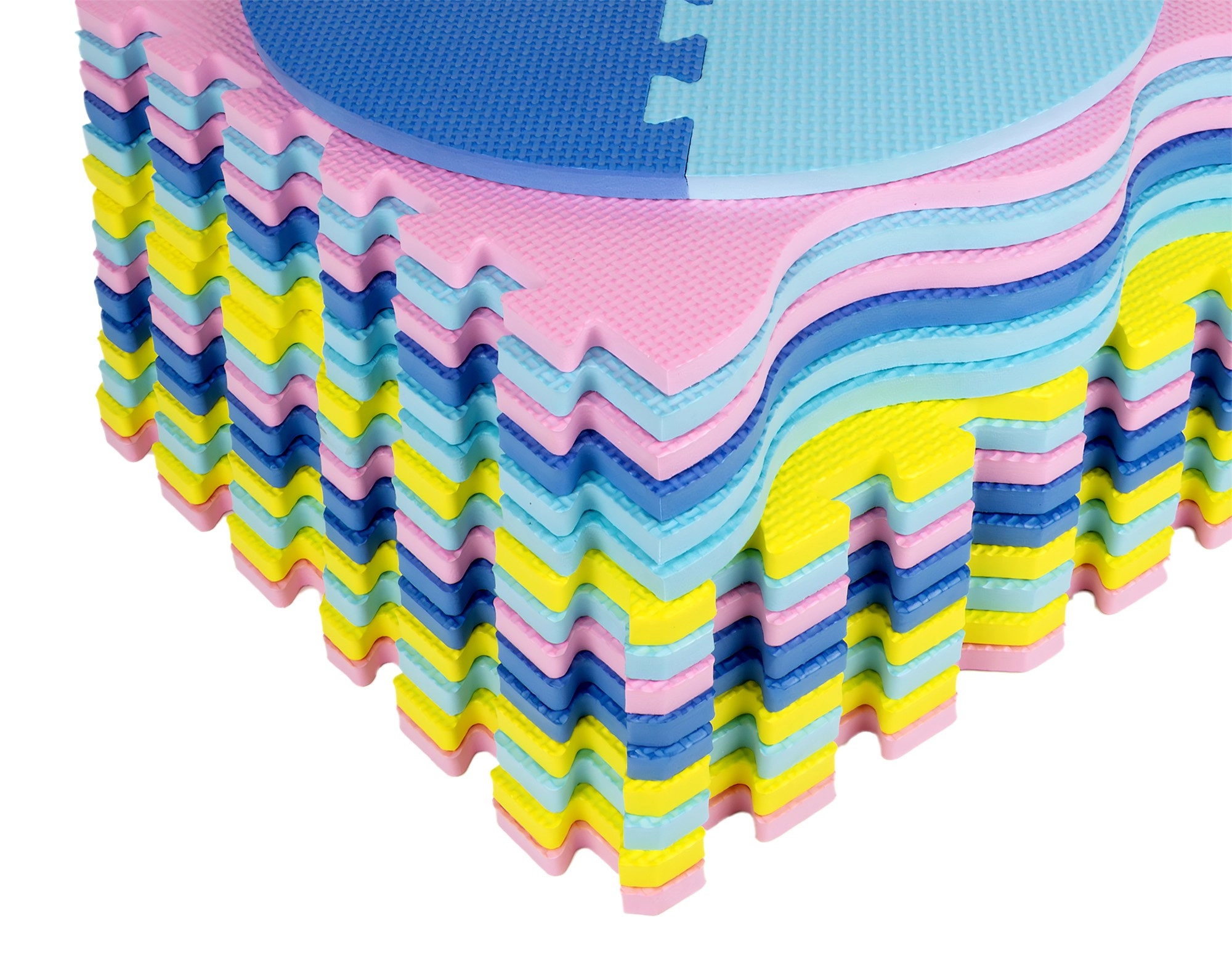 Materialet i EVA er vandtæt og nemt at rengøre – tør blot af med en fugtig klud. Måtten samler ikke støv eller mider og er derfor et ideelt valg til et rent og sundt miljø i børneværelset. Neutrale, men kontrastfulde farver (lyseblå og mørkeblå, gul, rosa) passer til interiøret og understøtter samtidig barnets koncentration.