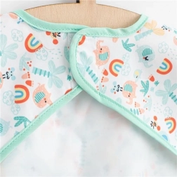 Lukning med velcro gør det nemt og hurtigt at tage på og af, mens den bløde frontlomme opfanger krummer og dråber. Forklædet er velegnet til fodring, selvstændig spisning og kreative aktiviteter. Moderne mønstre og den grønne farve glæder både børn og forældre.