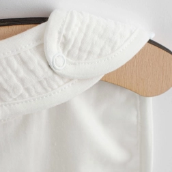 Takket være den praktiske trykknaplukning kan hagesmækken justeres i 2 størrelser, så den passer perfekt til både nyfødte og større børn. Musselin er kendetegnet ved sin holdbarhed – gentagen vask skader ikke materialet, tværtimod bliver det gradvist blødere og mere behageligt.