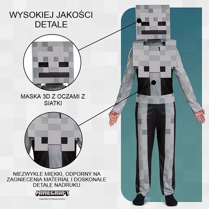 Forvandl din lille spiller til en frygtet modstander fra Minecraft-universet! Skeleton-kostumet i hvid variant gengiver troværdigt figurens udseende og er et godt valg til skolefastelavn, maskebal og temafester. Takket være det lette materiale er det behageligt for børn at have på og giver fri bevægelighed under leg.