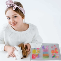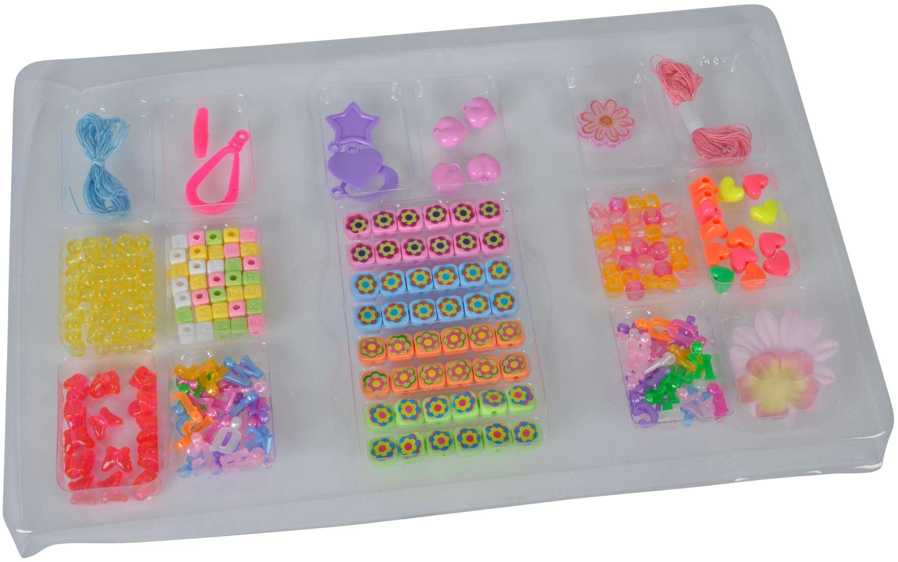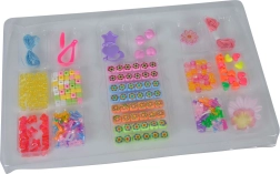 Dette rige sæt til små designere rummer alt, hvad der behøves for at skabe personlig smykkekunst. Børn kan sætte navne med bogstavklodser, kombinere runde og formede perler og supplere med dekorative blomster og vedhæng. Der skal blot bruges en saks til at klippe snoren og en smule fantasi.