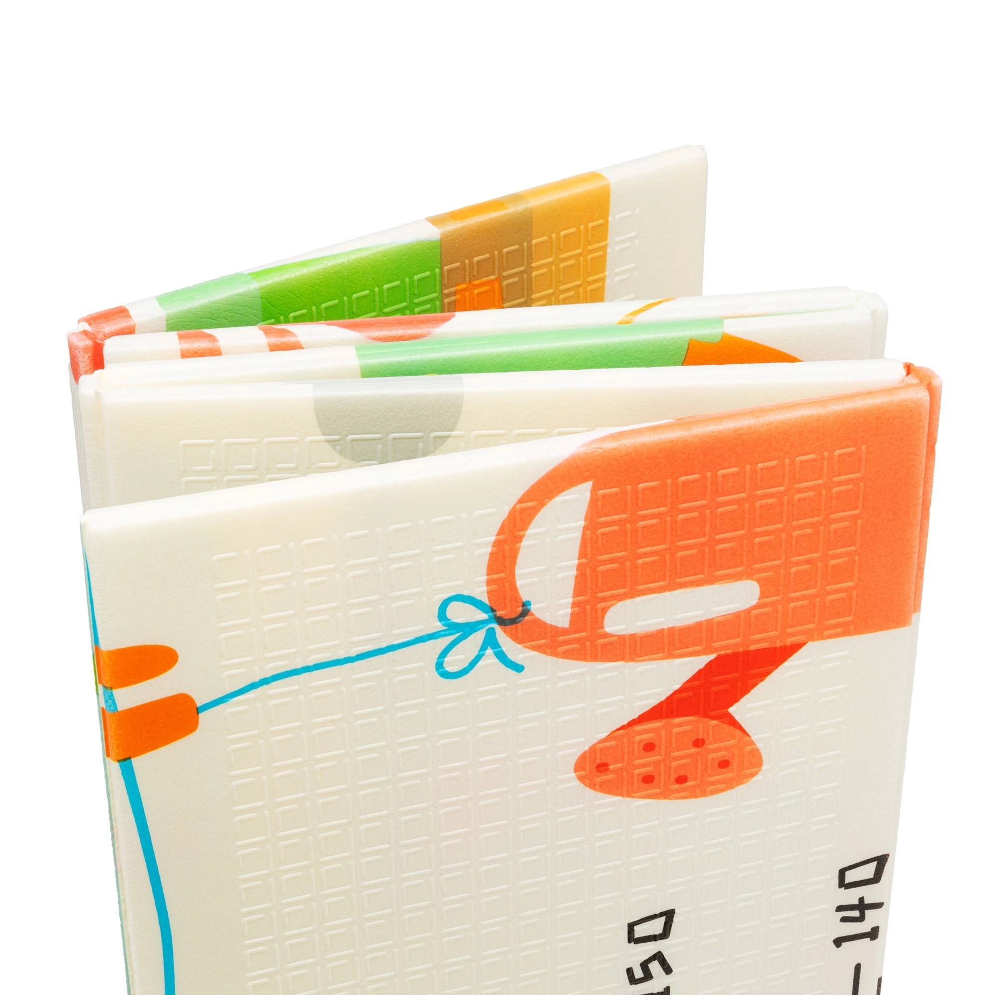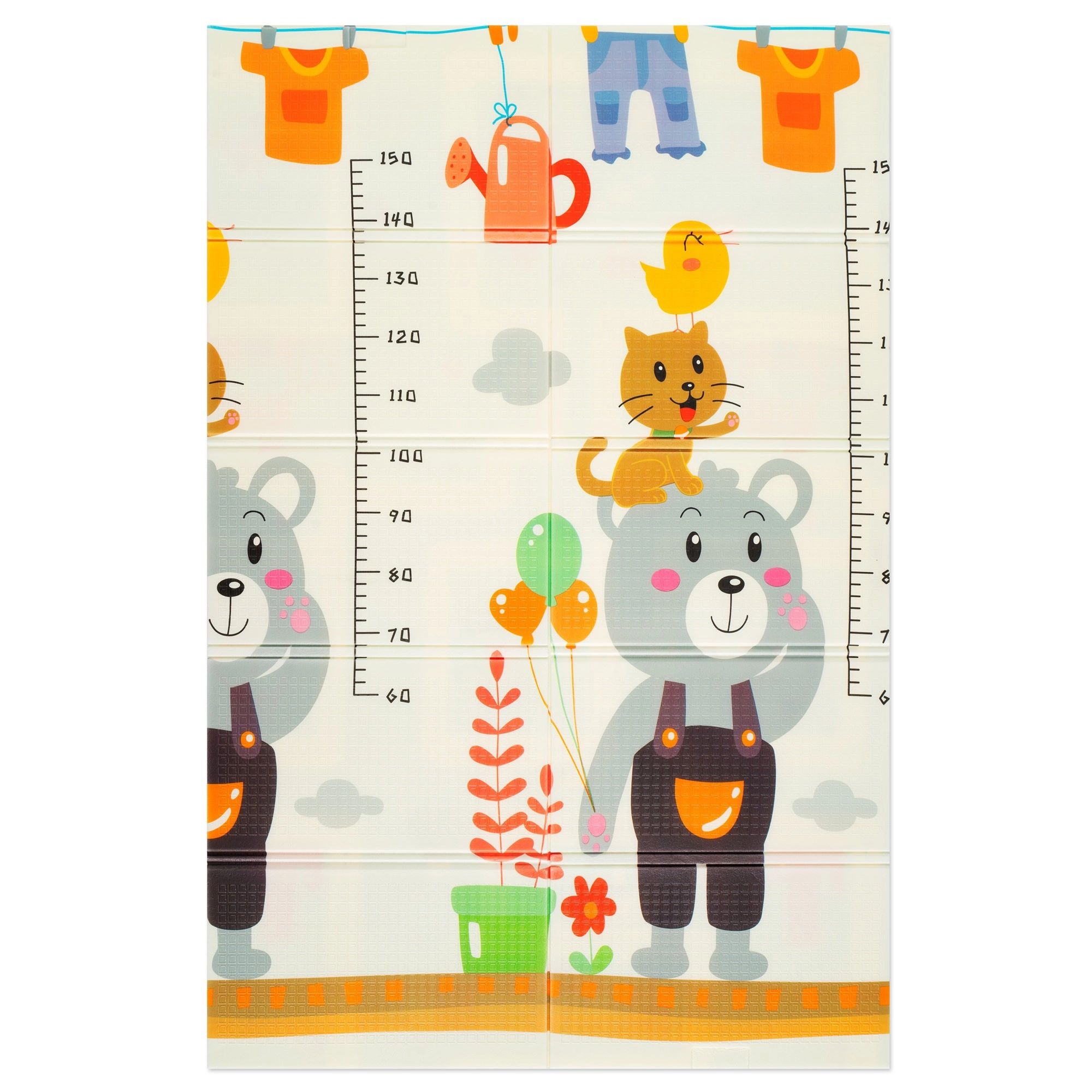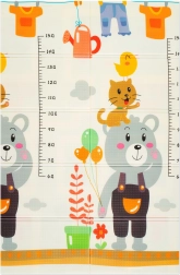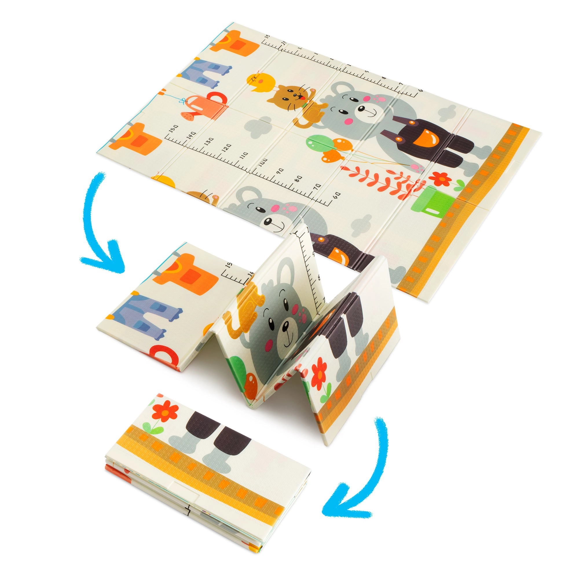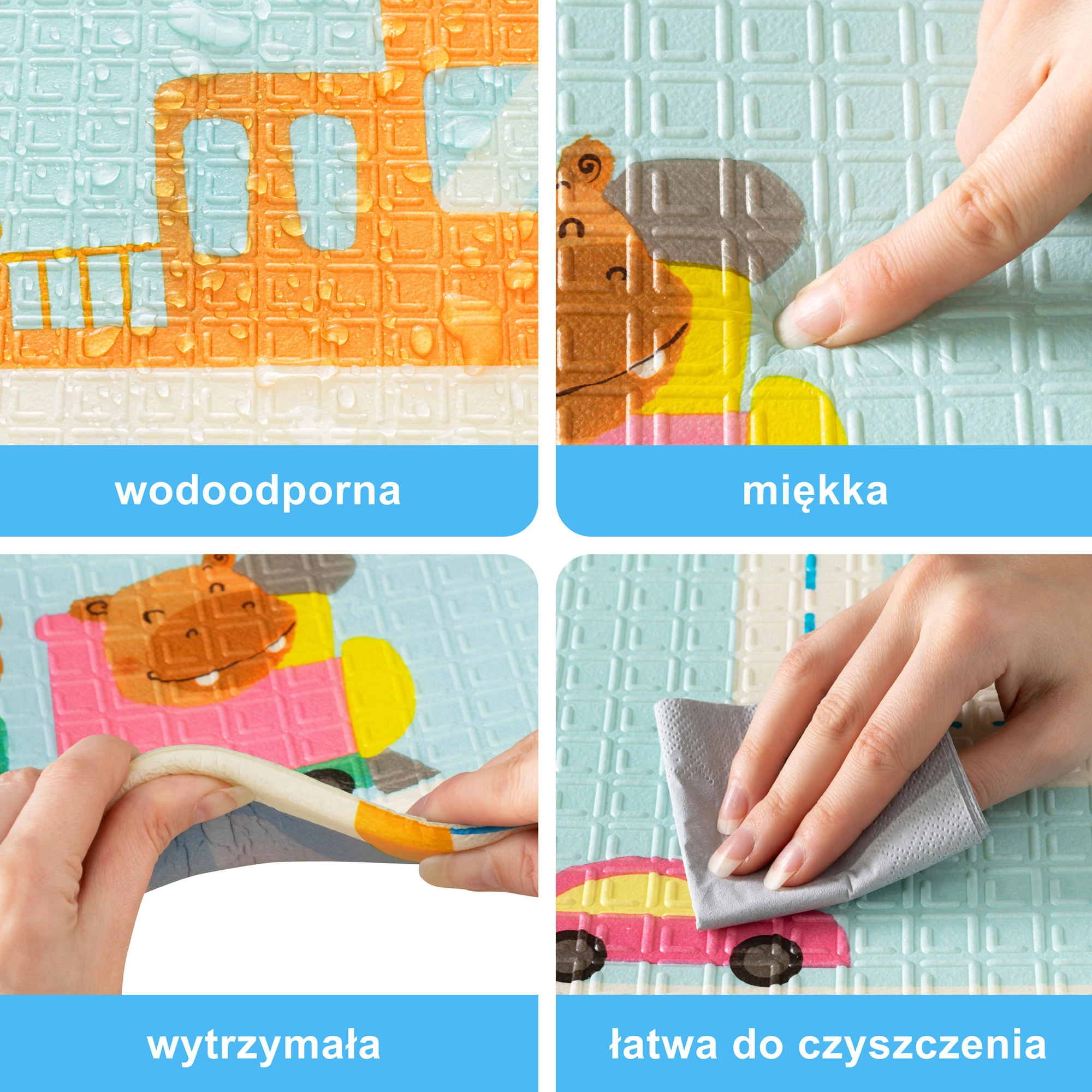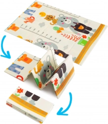 Det vendbare design tilbyder to lærende motiver: glade dyr med højdemåler til at følge væksten og farverige veje med bygninger og køretøjer til at udvikle fantasien. Måtten foldes på få sekunder, opbevares nemt og kan takket være den medfølgende taske med lynlås tages med overalt – i stuen, børneværelset, på altanen, i haven og på farten.