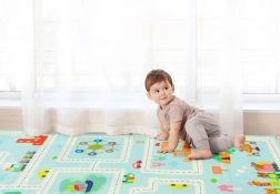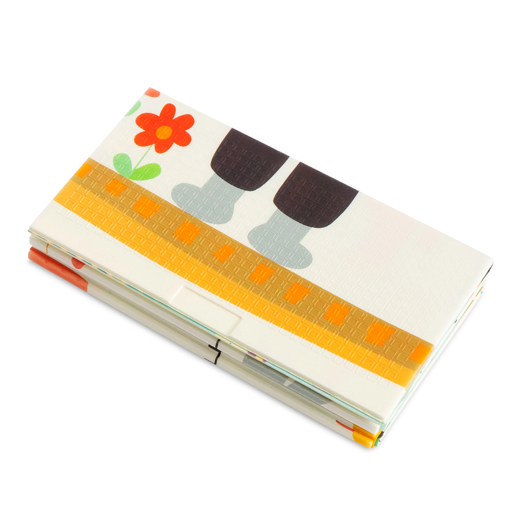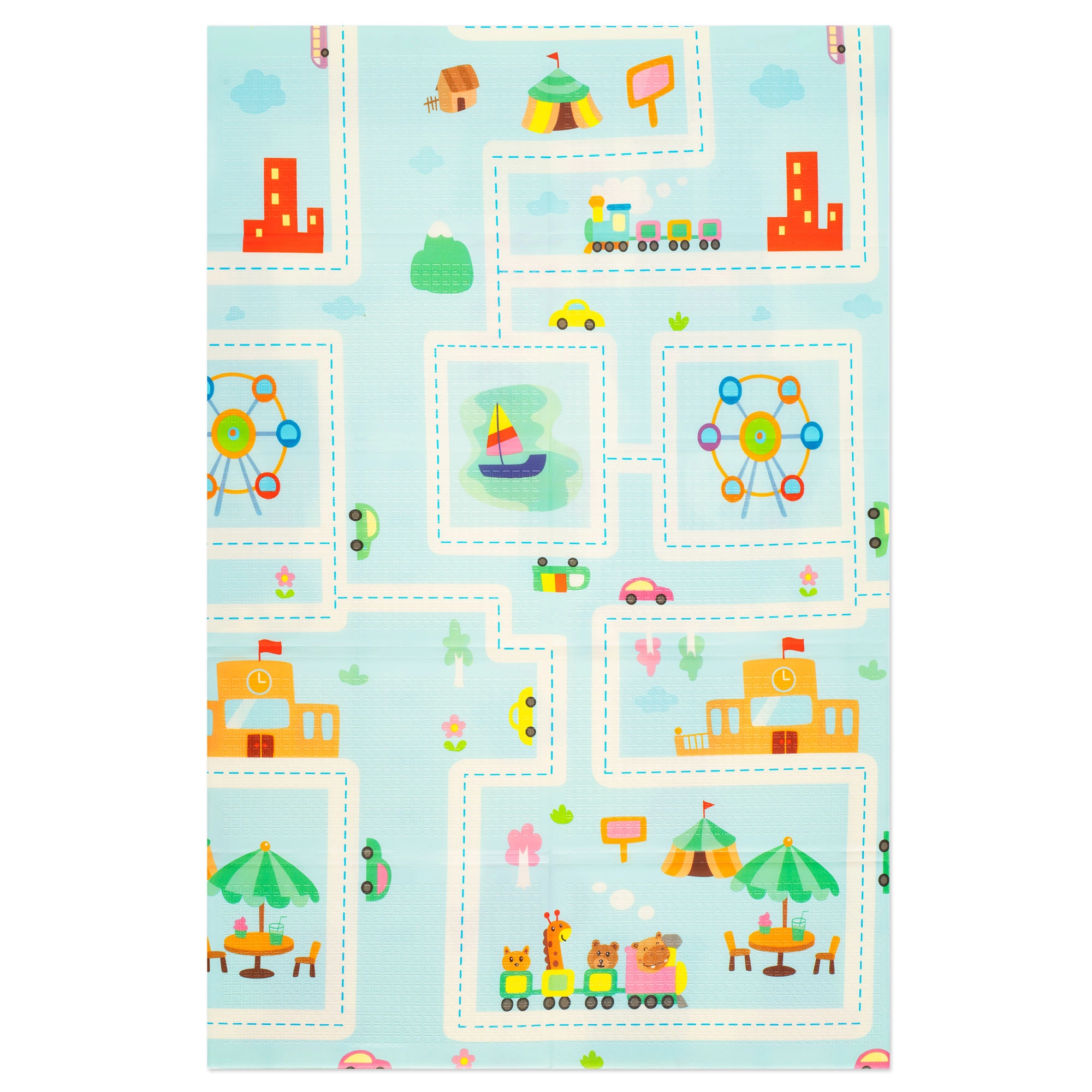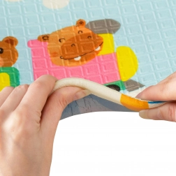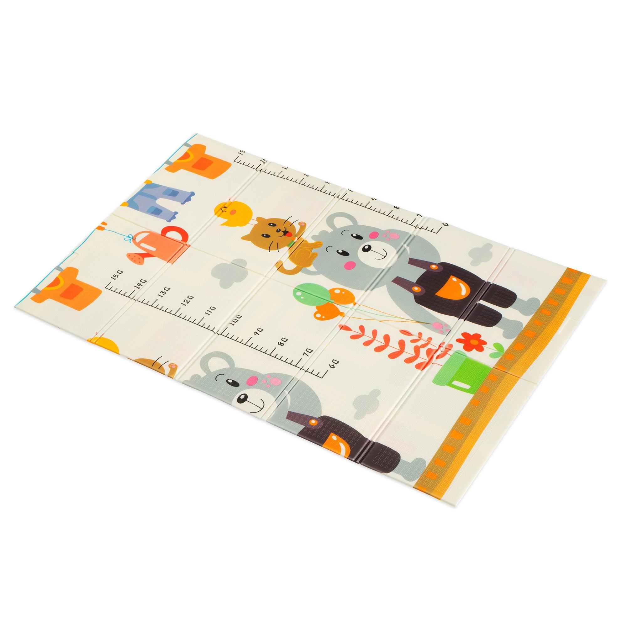 Det vendbare design tilbyder to lærende motiver: glade dyr med højdemåler til at følge væksten og farverige veje med bygninger og køretøjer til at udvikle fantasien. Måtten foldes på få sekunder, opbevares nemt og kan takket være den medfølgende taske med lynlås tages med overalt – i stuen, børneværelset, på altanen, i haven og på farten.