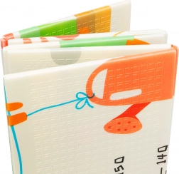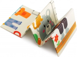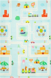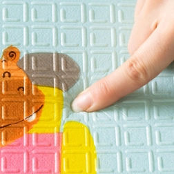 Den ene side byder på glade dyremotiver med højdemåler, den anden side farverige veje og bygninger, som stimulerer fantasi og sanser.