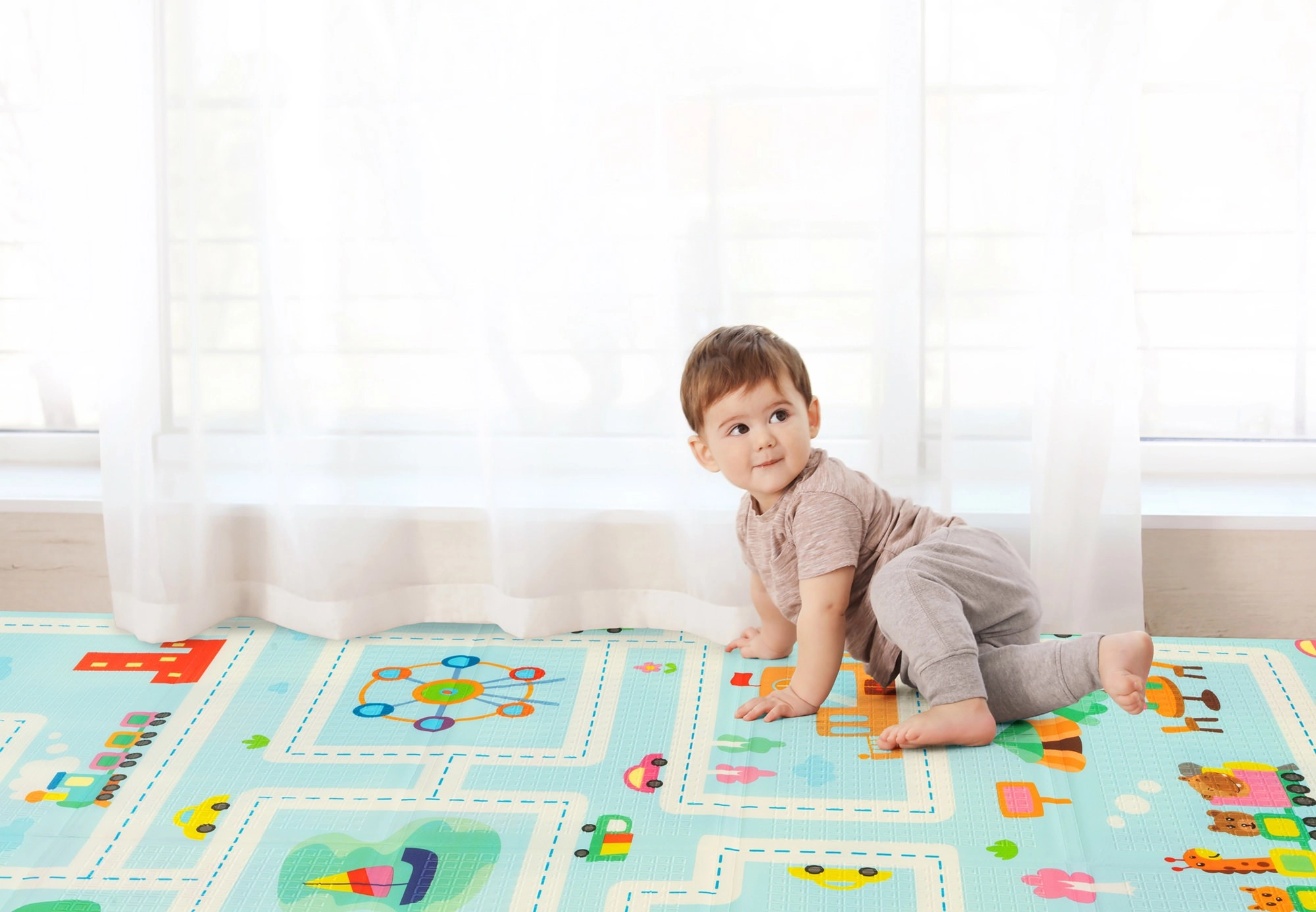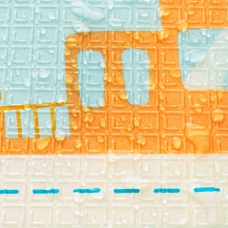 Tykt, elastisk og ikke‑giftigt XPE-skum dæmper effektivt fald, isolerer mod kulde fra gulvet og er lugtfrit. Overfladen er vandtæt og let at rengøre.