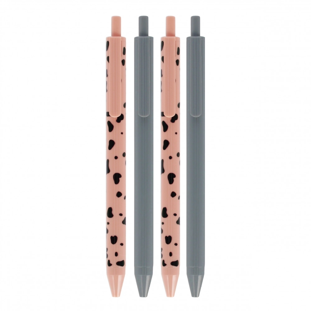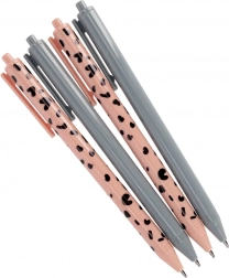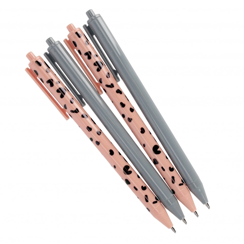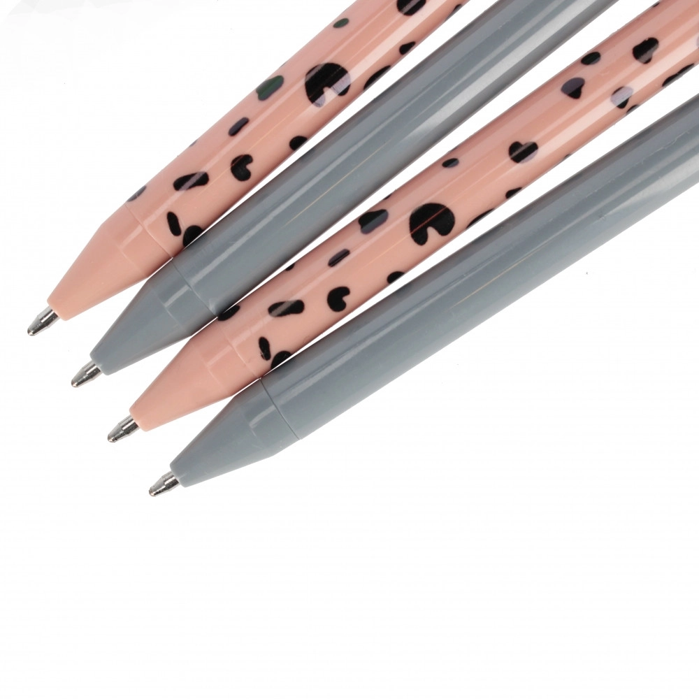 Dette sæt indeholder 4 elegante kuglepenne – to i diskret grå og to i rosa med dekorativt mønster. Den ergonomiske, slanke form og det glatte pennehus sikrer et behageligt greb og pålidelig skrivning uden afbrydelser. Ideel til noter, planlægning og dagligt arbejde.