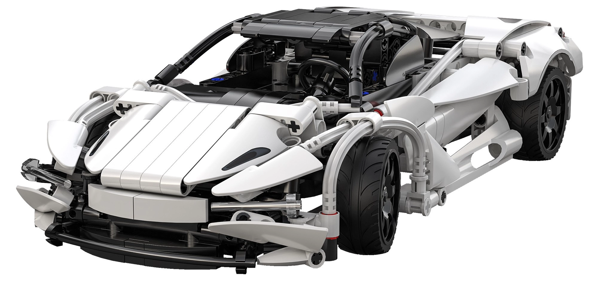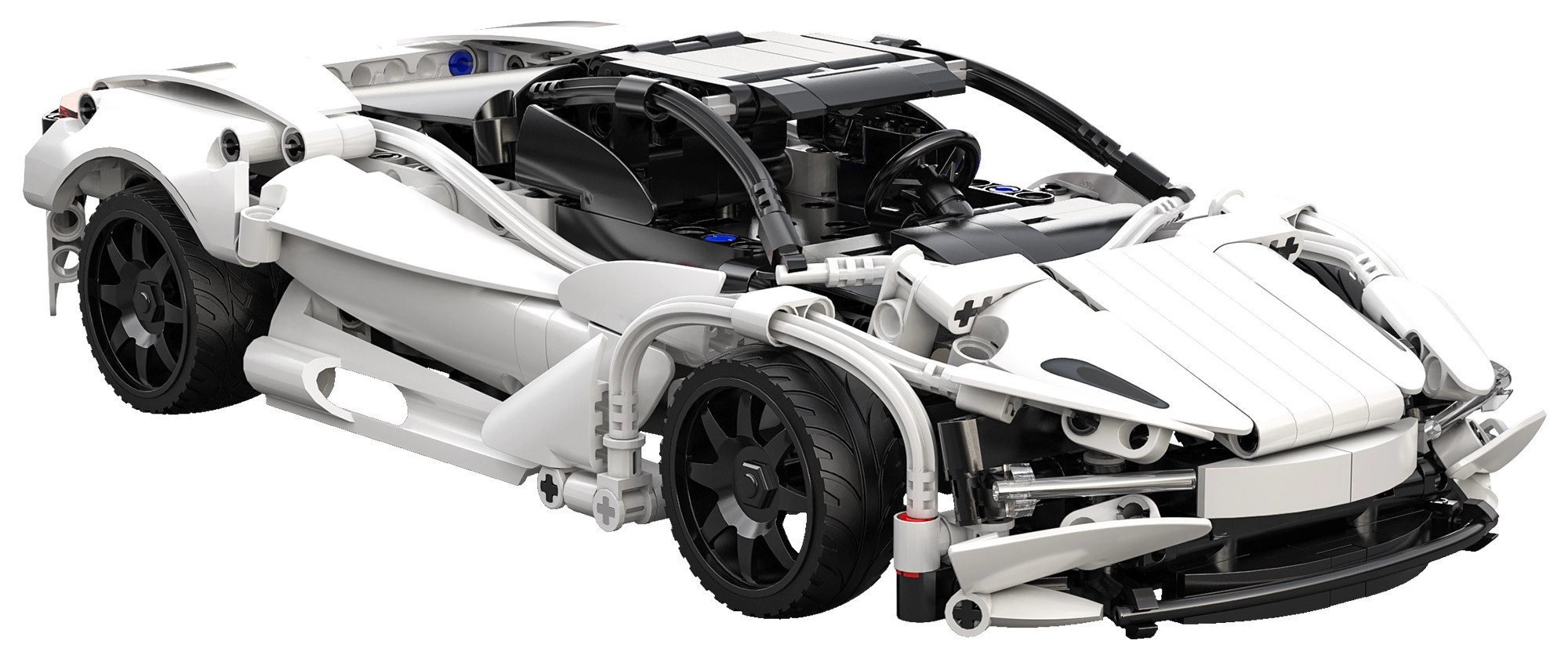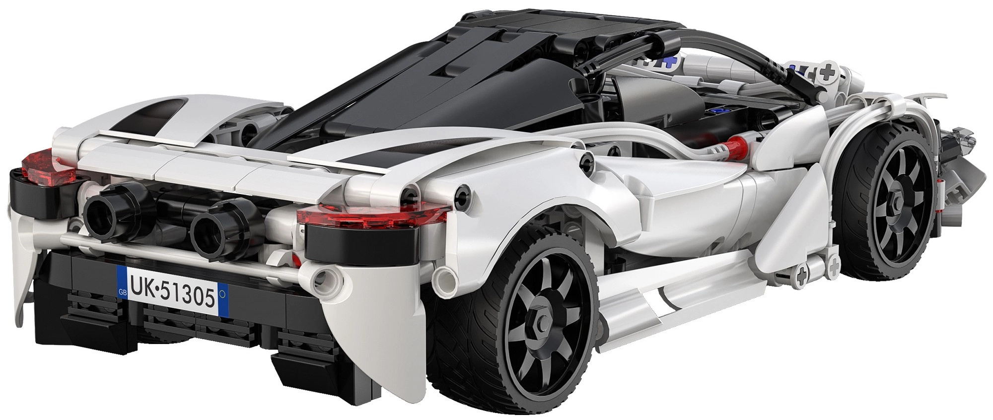 Detaljeret hvid karrosseri med sorte elementer, åbnbar motorhjelm og gummihjul for sikkert greb på underlaget. Flot udseende og funktion.