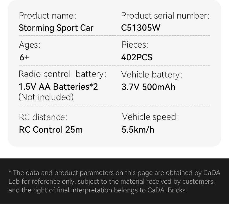 CaDA sportsvogn udmærker sig ved realistiske proportioner, robust konstruktion og et attraktivt hvidt karrosseri med sorte elementer. Takket være drivlinjer og præcis styring får du jævn kørsel frem og tilbage samt præcis styring. Dual Mode giver mulighed for styring med en klassisk controller eller en smartphone med Bluetooth – sjov både inde og ude.