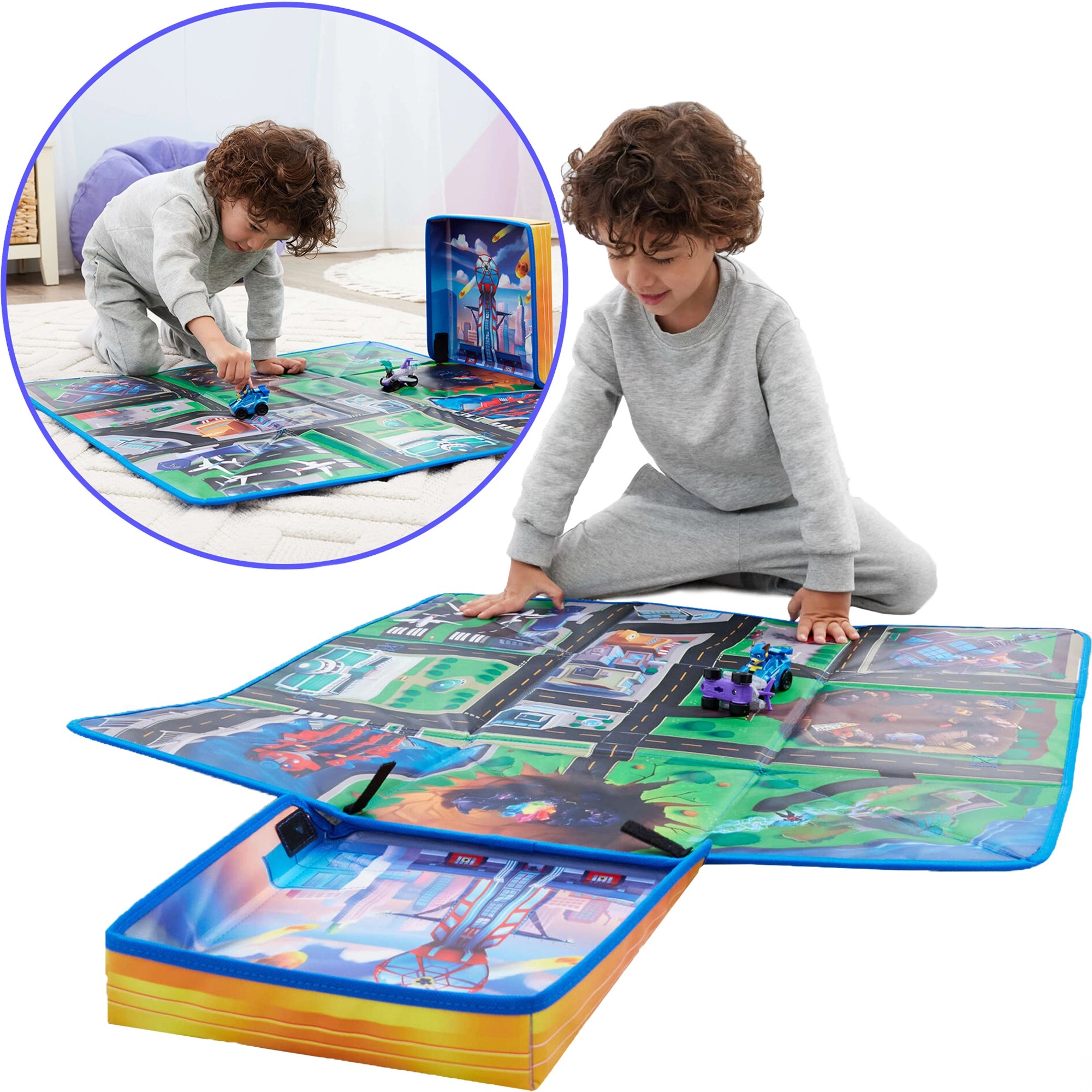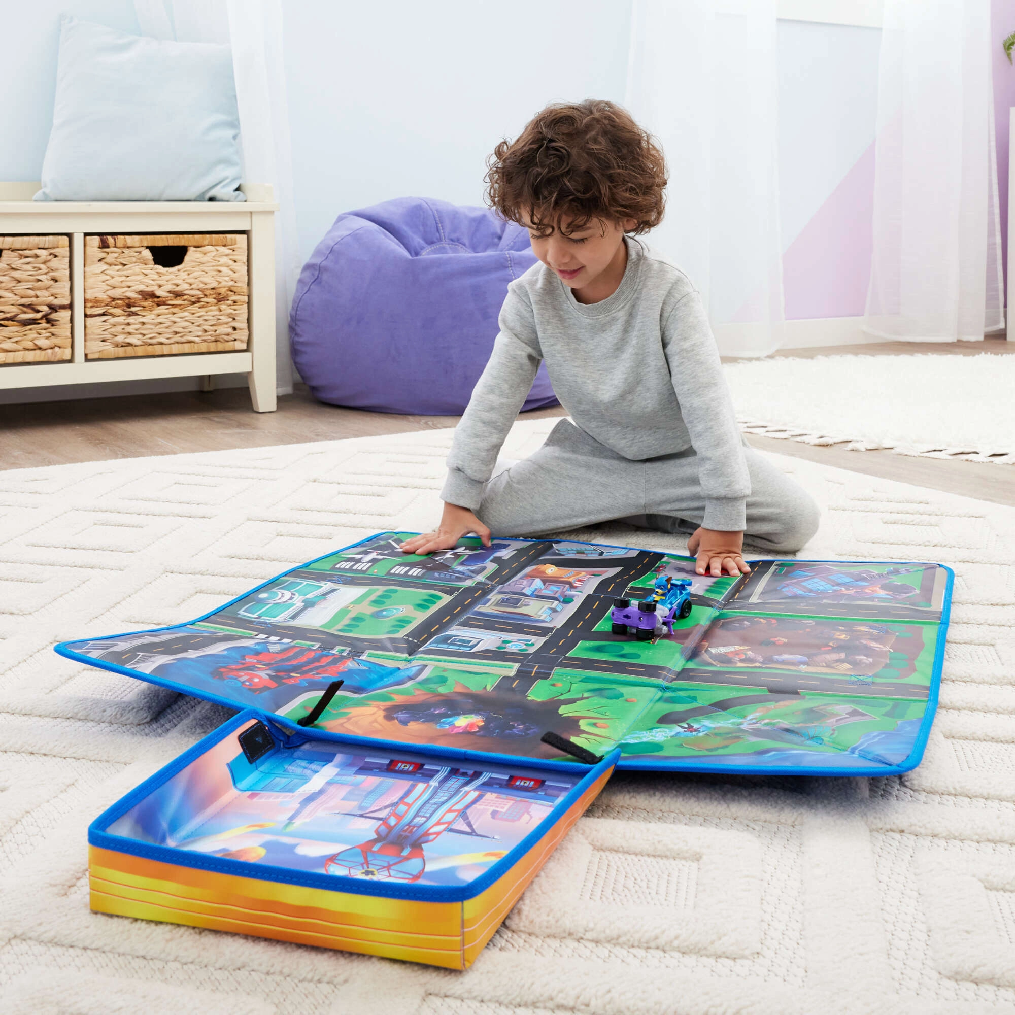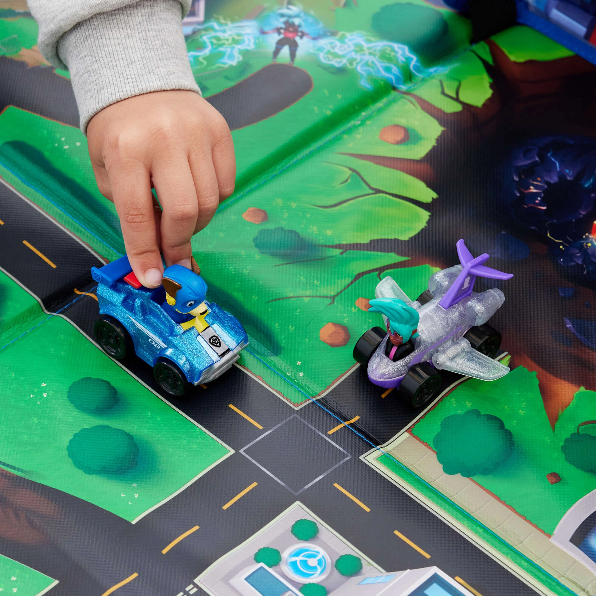 Når legen er slut, forvandles måtten på et øjeblik til en stabil opbevaringsboks på 25,4 × 25,4 × 25,4 cm, som rummer både biler og figurer. I pakken finder du også Chase Rescue Racer og den eksklusive Vee Rescue Racer, så I kan komme i gang med det samme.