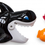 Tryk på aftrækkeren på håndtaget, så åbner spækhuggerens mund sig for at “sluge” de flydende fisk. Ideelt til træning af koordination og præcision.