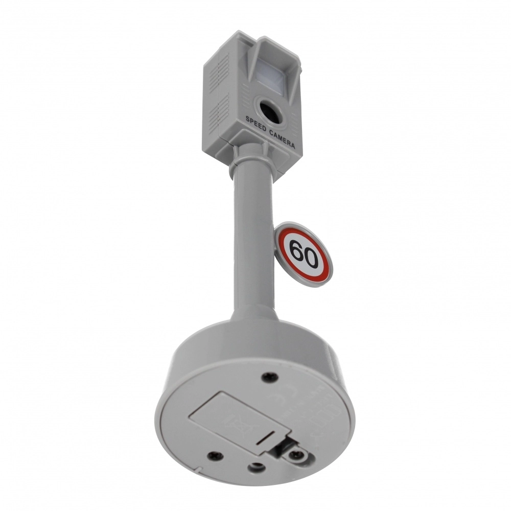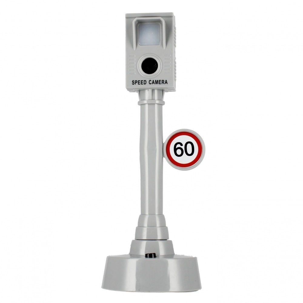Trafiklyset skifter farver til at styre et kryds, og fartmåleren reagerer ved tryk med kameralyden og lys – perfekt til realistisk leg.
