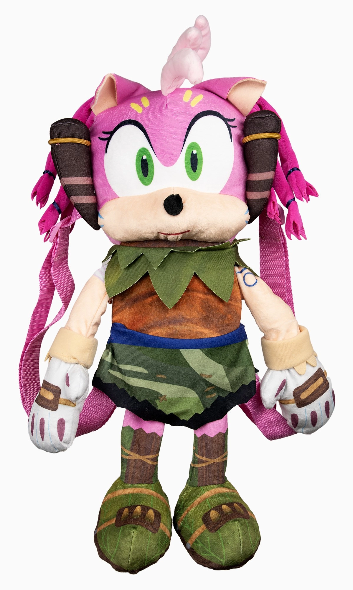 Rygsækken har justerbare skulderremme, så den nemt tilpasses barnets figur. Lynlåslommen rummer småting som lommetørklæder, nøgler eller små snacks. Den detaljerede udførelse – lyserød pels, grønne sko, nederdel og hvide handsker – afspejler trofast Amy Rose og giver rygsækken et unikt udseende.