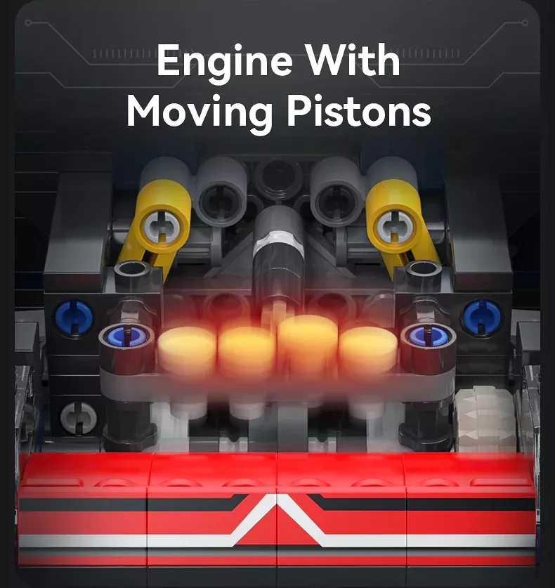 Åbningsbare døre, motorhjelm og bagagerum afslører kabinen med sæder og rat samt motorrummet. Realistiske elementer øger bygge- og legeoplevelsen.